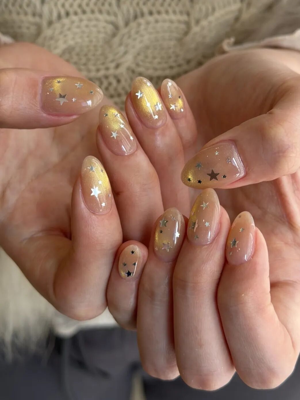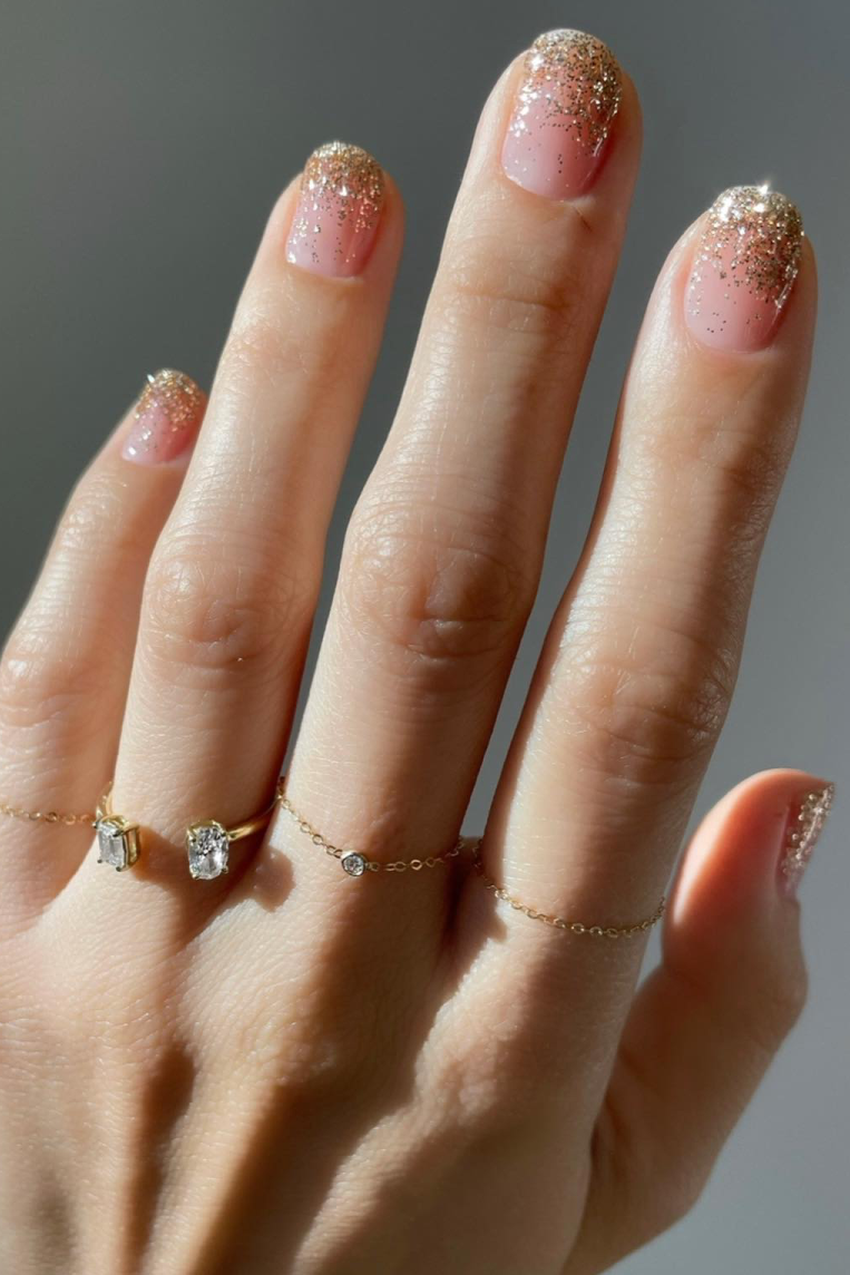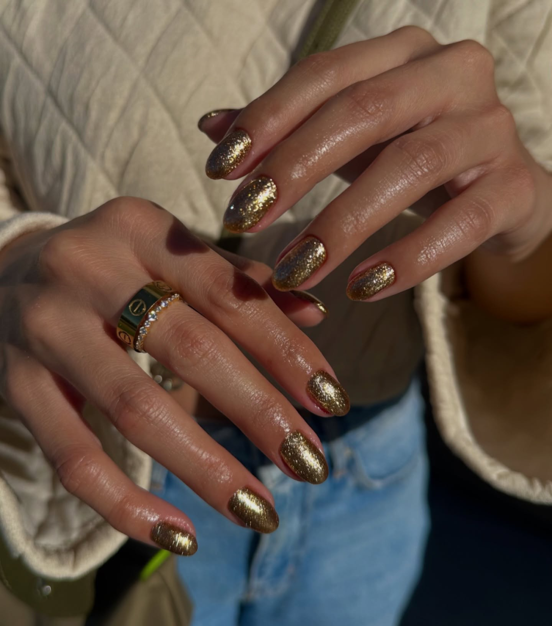另外最近ins上也很流行这种粗颗粒感的金色闪片美甲,满涂就是那种在不同光源下能折射出五彩斑斓的金色的效果。