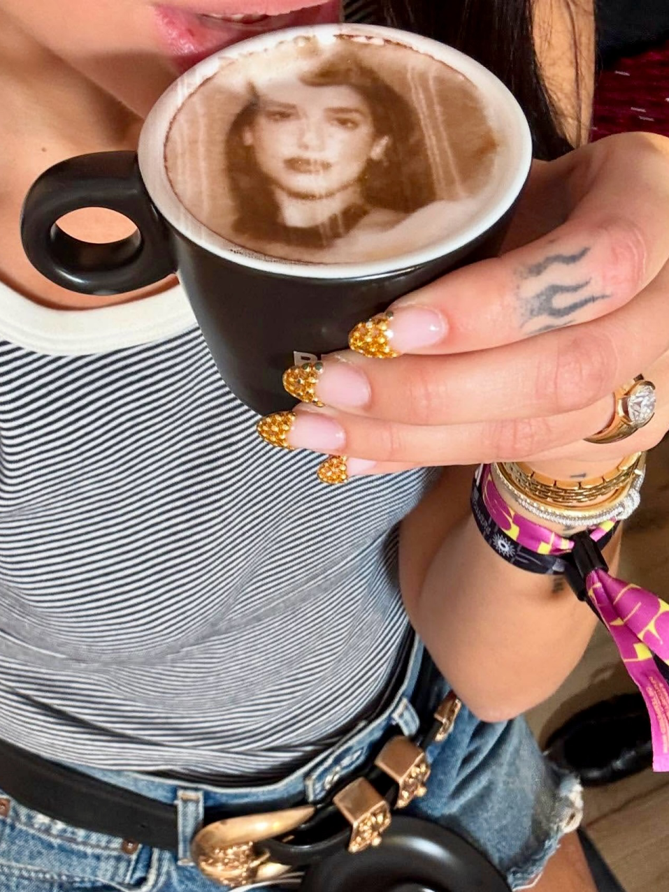 Dua Lipa则像是一手掌握了“财富密码”。美甲师Michelle Humphrey直接用小金豆给她做了个宽边法式,非常符合她又辣又复古时髦的风格。