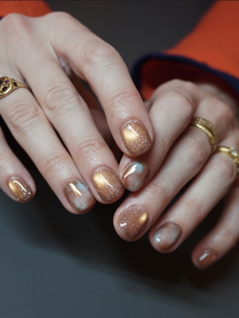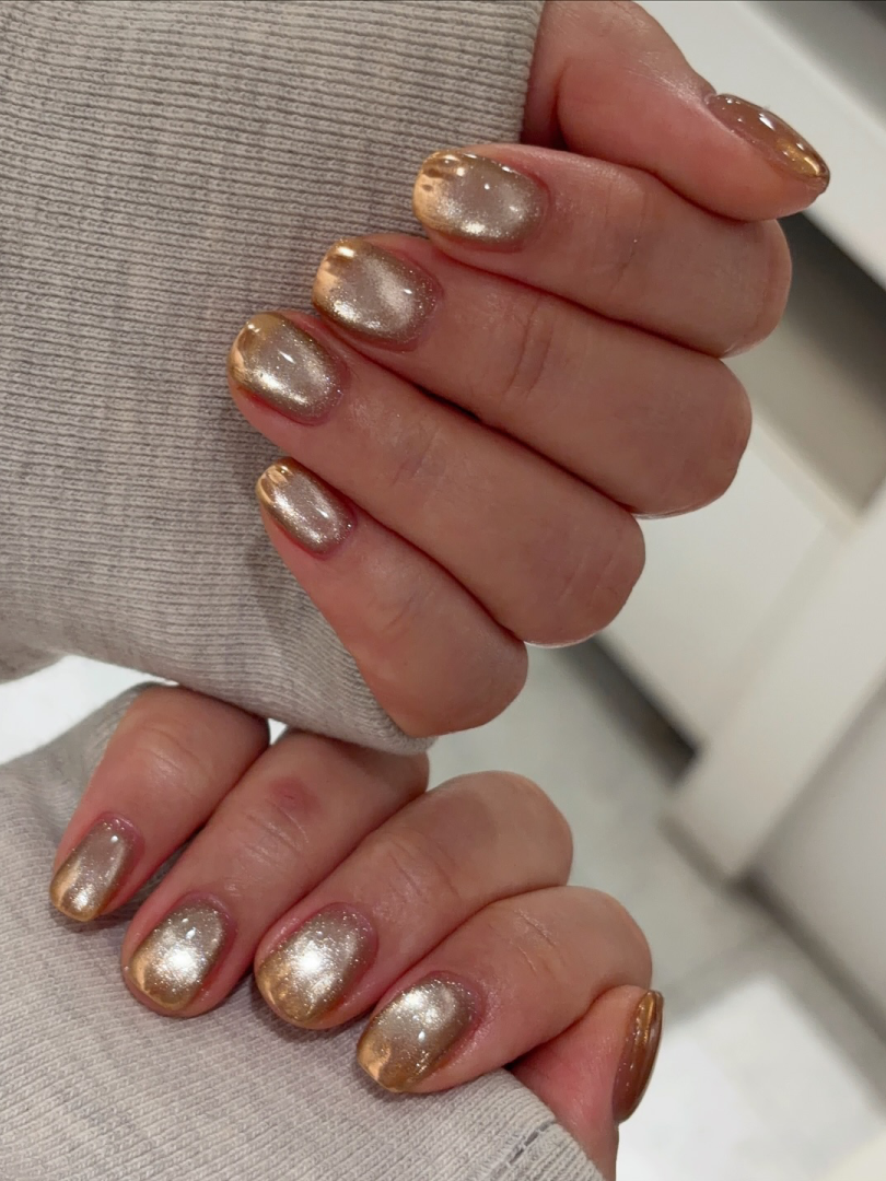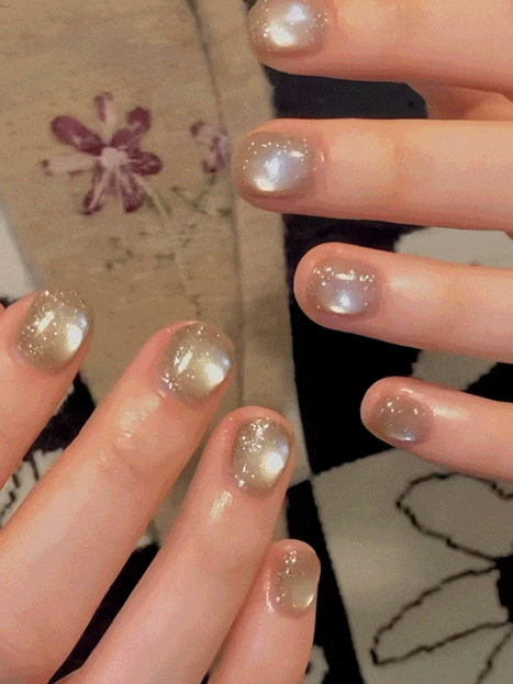 这两年猫眼美甲也是火出天际。预测这款金色魔镜粉+香槟金色猫眼的组合会成为新春美甲的大爆款,款式做法很简单,效果却绝对不一般。