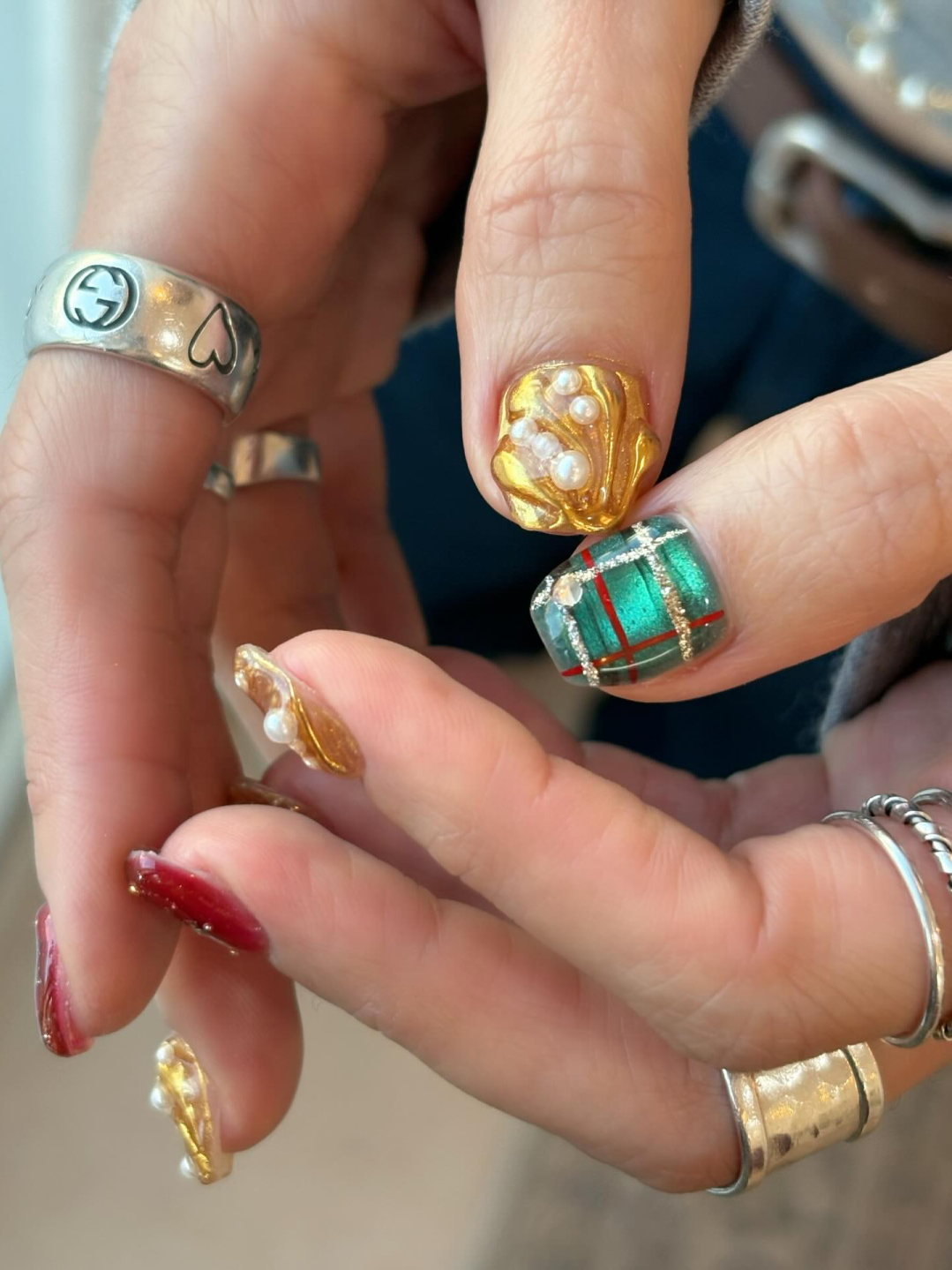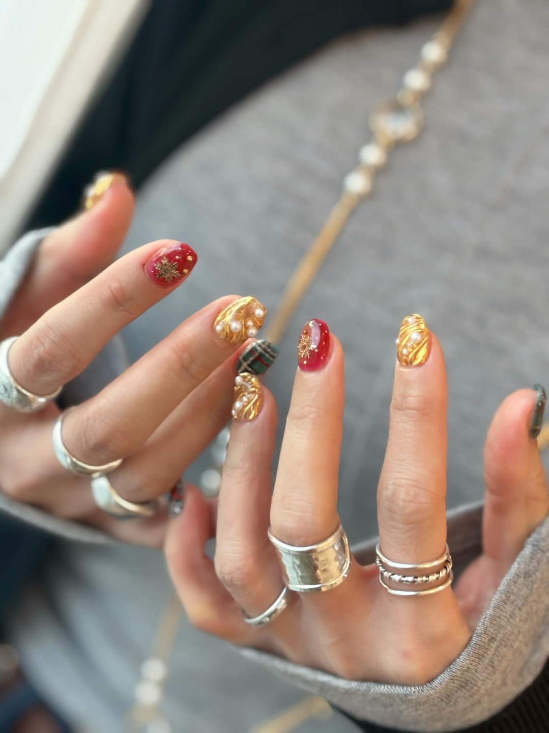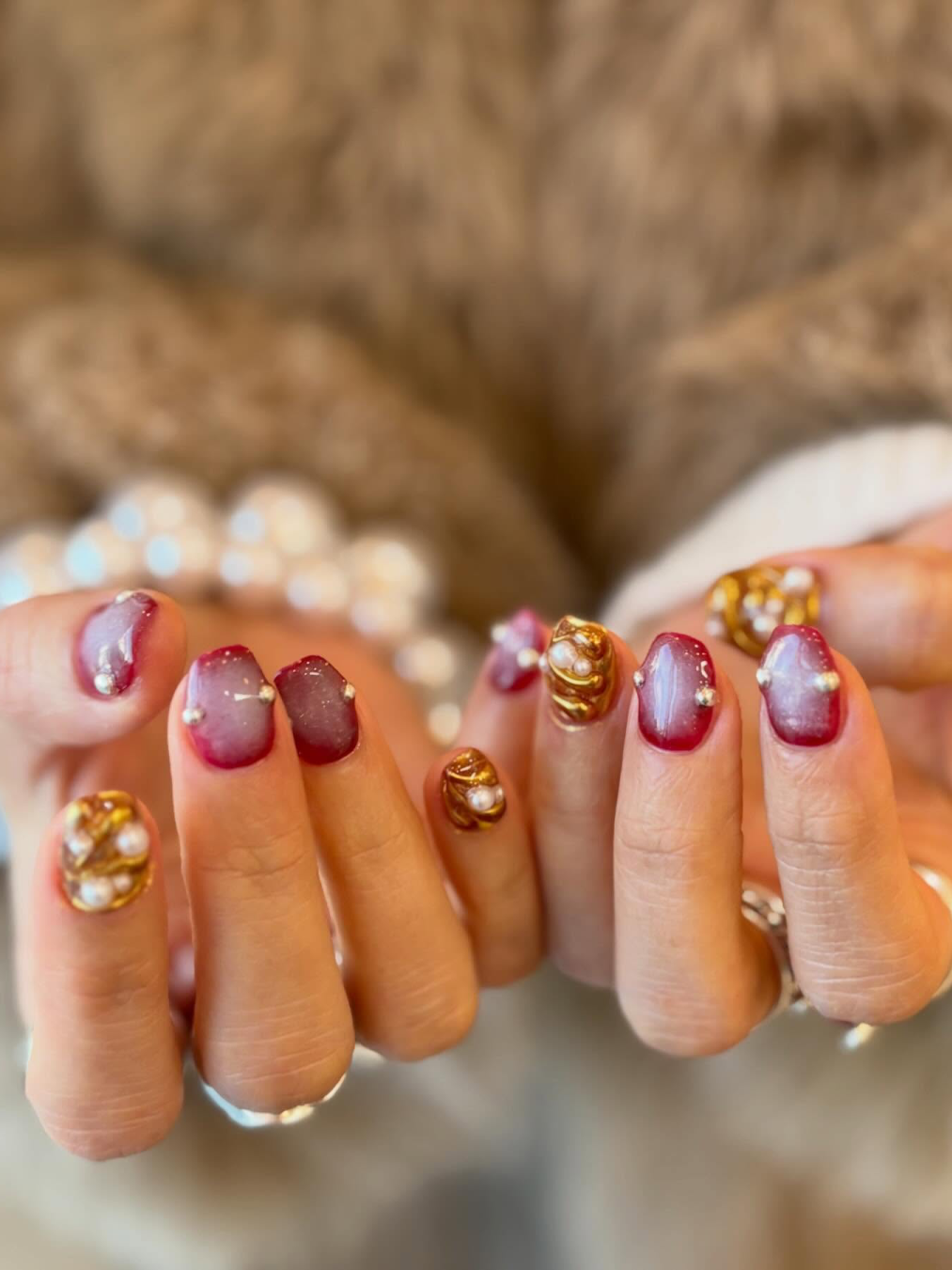所谓“经济上行期的美”大概就是这种款式了。用固态胶、堆堆胶塑形,让甲面增添更多肌理感,再用魔镜粉塑造24K纯金光泽,点缀上珍珠、小金豆,过年的喜庆有这双手就够了。