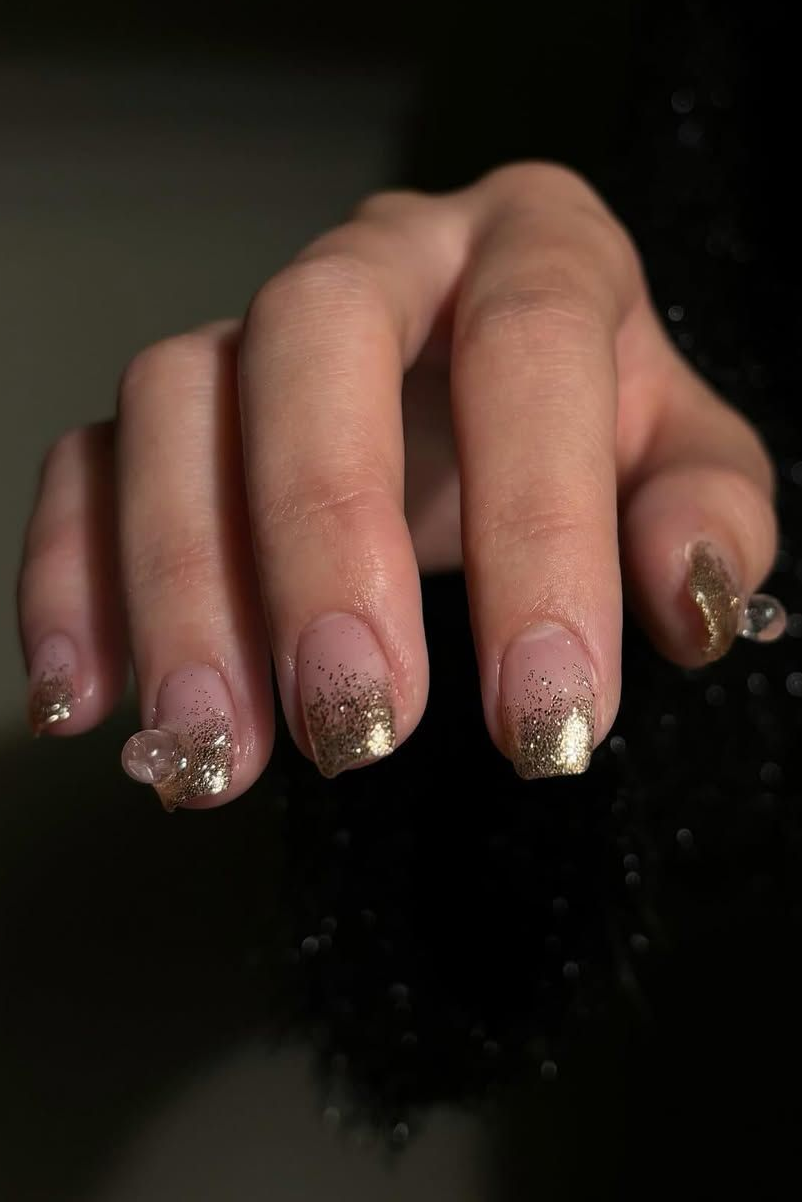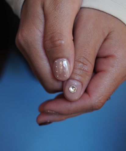 想低调点的姐妹可以用尺寸小一点的小金豆应应景。在裸透色+珍珠粉的打底下,小金豆的光泽显得含蓄又内敛。再搭配一下金色猫眼,外加适合自己生肖的新年幸运色,一款独一无二的美甲创作思路不就有了吗?
