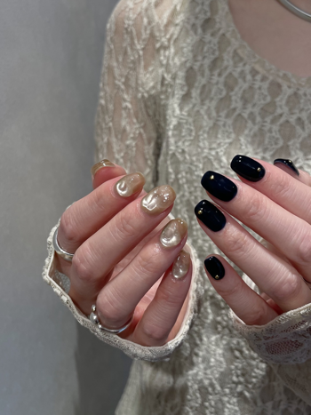 小金豆的应用场景还可以是点缀在纯色美甲上,如果你正好要做一个AB款(一手一款),不妨试试这种组合。