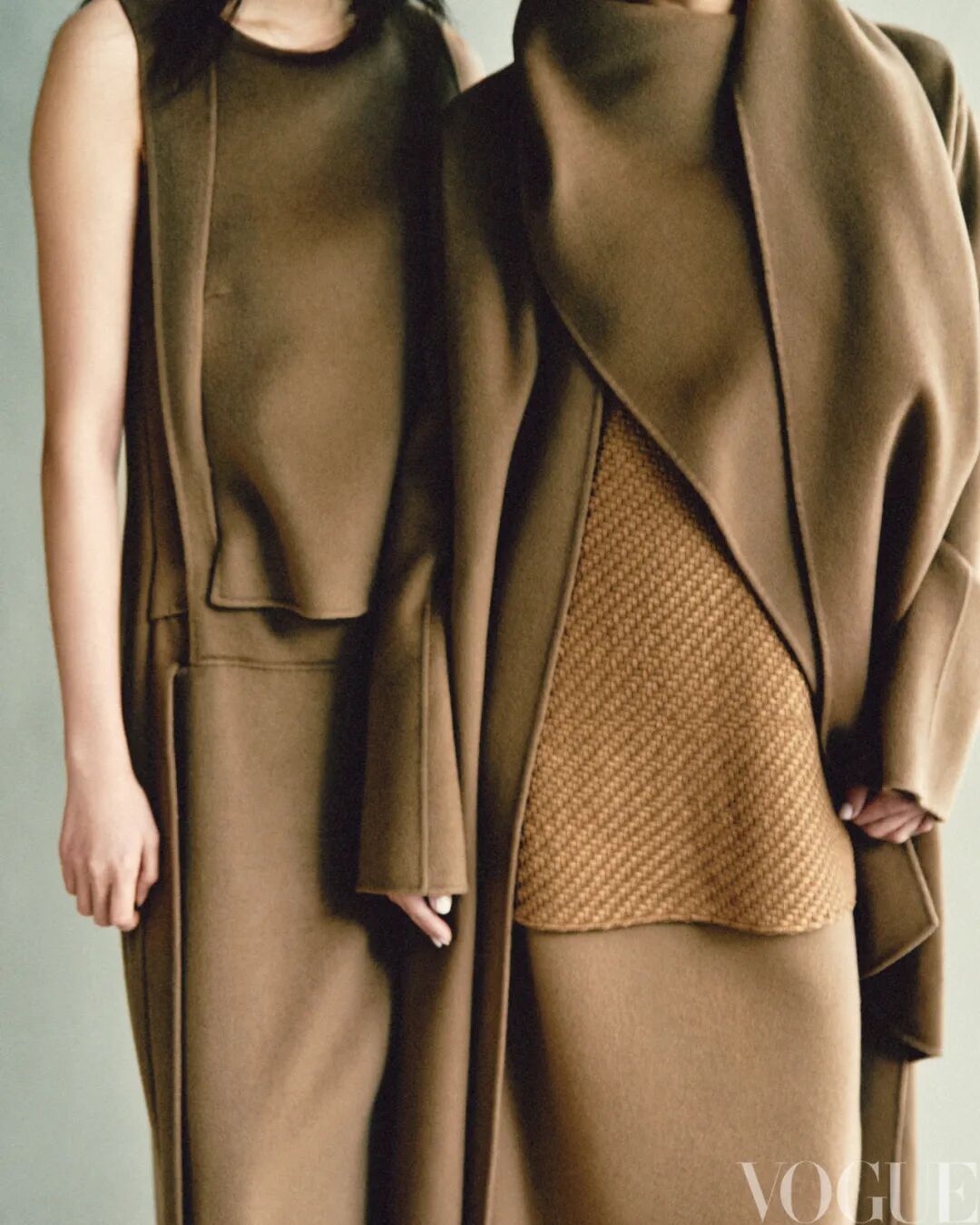 2025秋冬系列Nisa驼色双面羊绒无袖解构连衣裙;2025早秋系列Tile金色编织U形领背心、Tile驼色羊绒铅笔裙、2025秋冬系列Cooperi驼色双面羊绒围巾大衣 均为Ruohan