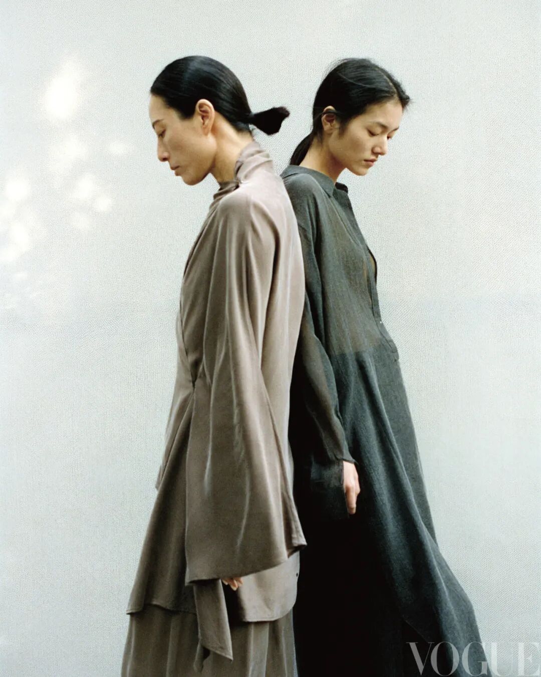 2025秋冬系列Iona灰色铜氨丝斜襟纽扣上衣、Hadia灰色铜氨丝对襟裤;2026早秋系列Lemno长款衬衣、Skirt Pants直筒裙裤 均为Ruohan