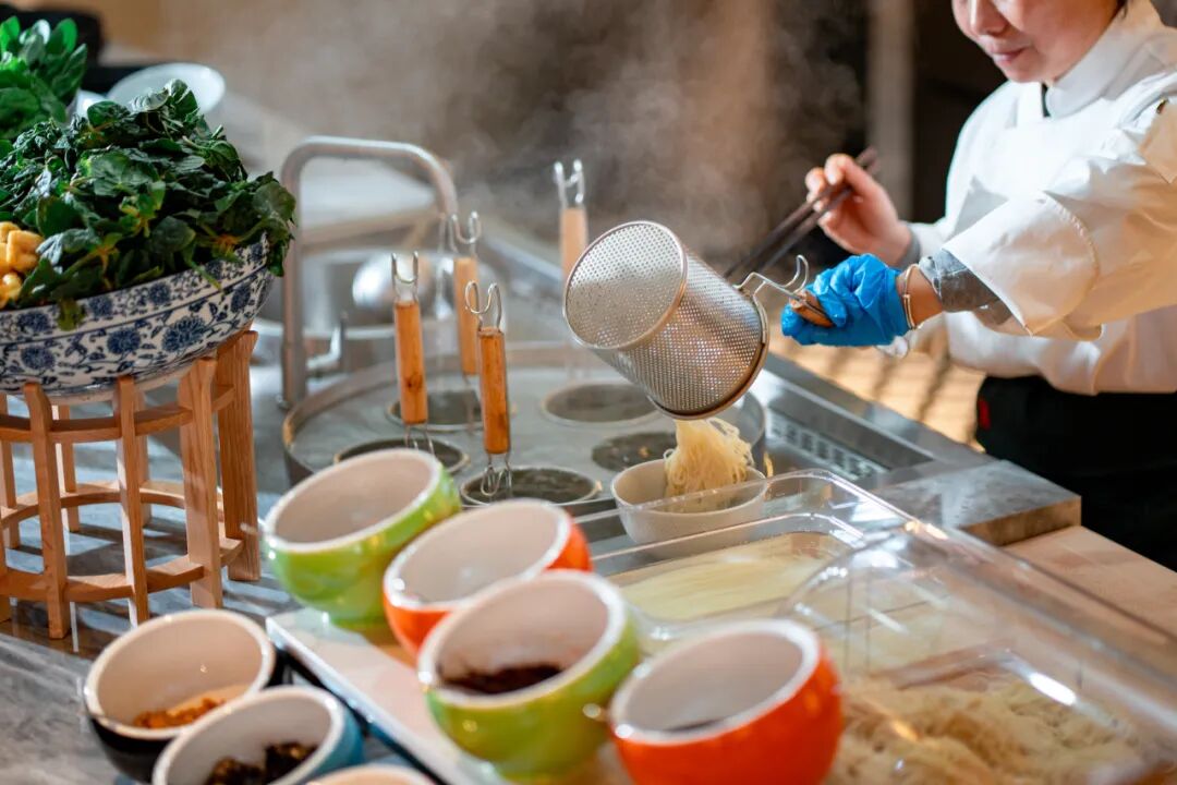 营业至深夜的特色面档麺家,是深夜的暖心港湾。开放式烹饪台前,厨艺大师现场制作地道手工面、米粉、馄饨等风味小吃。