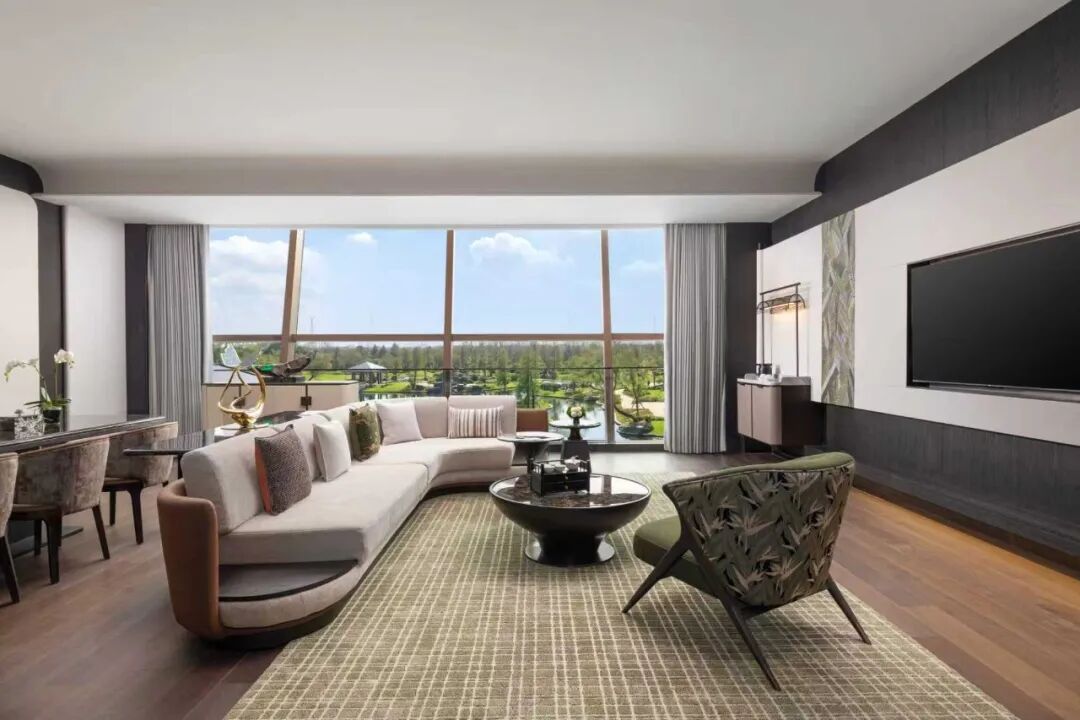「行政豪华套房」彰显奢阔格局与中式意韵,带来尊贵而不失松弛感的居停体验。客厅L型沙发围合出宽敞的社交区域,圆形茶几与精致花艺点缀其间,赋予空间设计感与生动气息。用餐区与休闲区划分明晰,无论是商务洽谈还是亲友相聚,皆可在舒适的环境里从容展开。