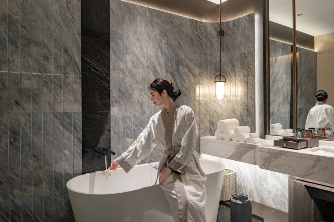 卫浴空间秉承自然设计理念,深浅石材对比勾勒出奢华质感。配备智能卫浴系统及国际知名水疗品牌洗护,打造身心愉悦的沐浴体验,洗去倦意,回归轻松自在。