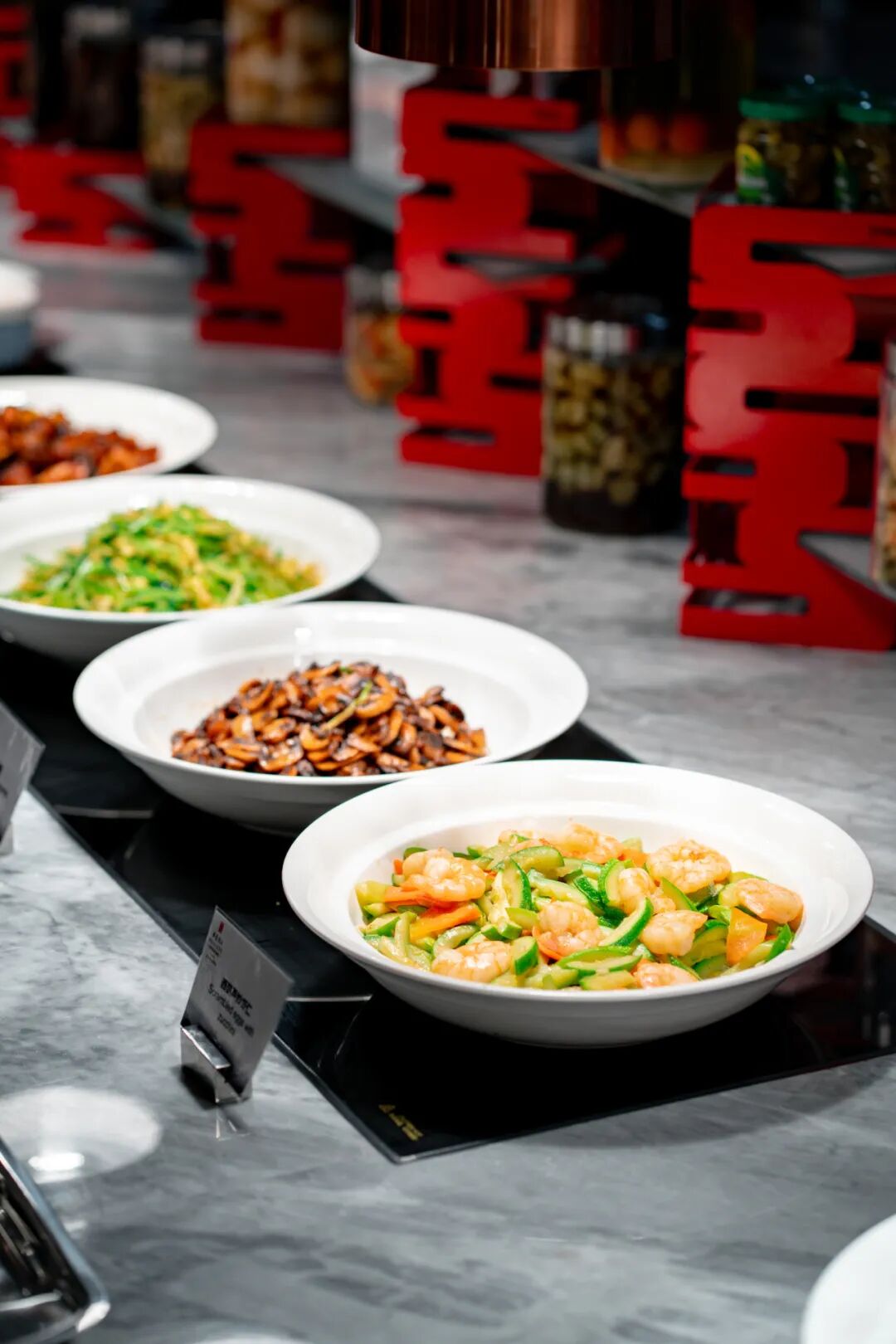 室内设110餐位,室外设110露台观景餐位,开放式厨房现场演绎环球美食,主厨每月定制的时令特色菜,将吕四港渔获与异国香料碰撞出奇妙火花,南北美点、现开生蚝、手工拉面等多风味档口,构筑起全天候的美食社交场。