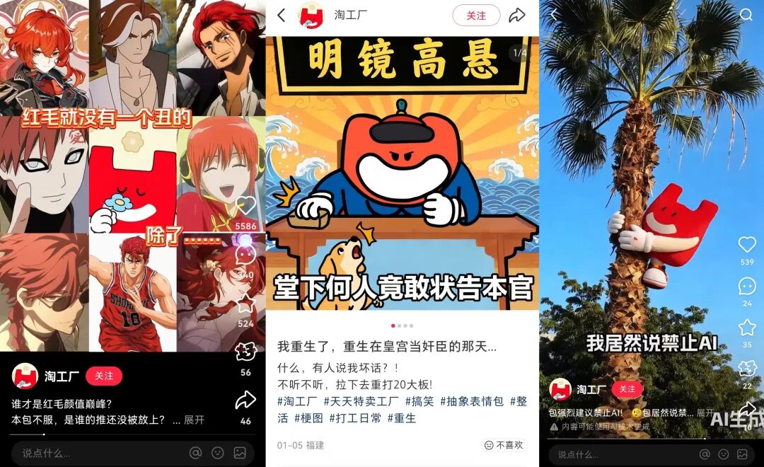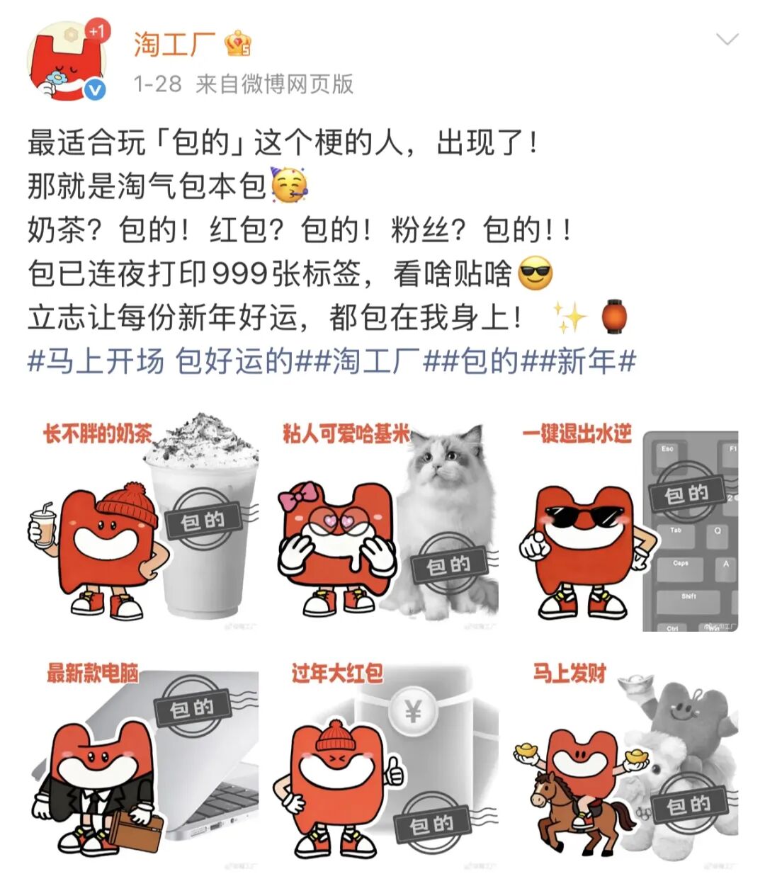 其实,淘工厂靠 IP 玩梗出圈早就不是第一次了,之前就围绕淘气包的“包”字,在微博玩起了谐音梗大赏,“奶茶包的、红包包的、好运包的”,用年轻人熟悉的玩梗,把“淘气包”这个 IP 稳稳种进了大家心里,也让网友分分钟记住“淘工厂=会玩、不端着、接地气”的人设。