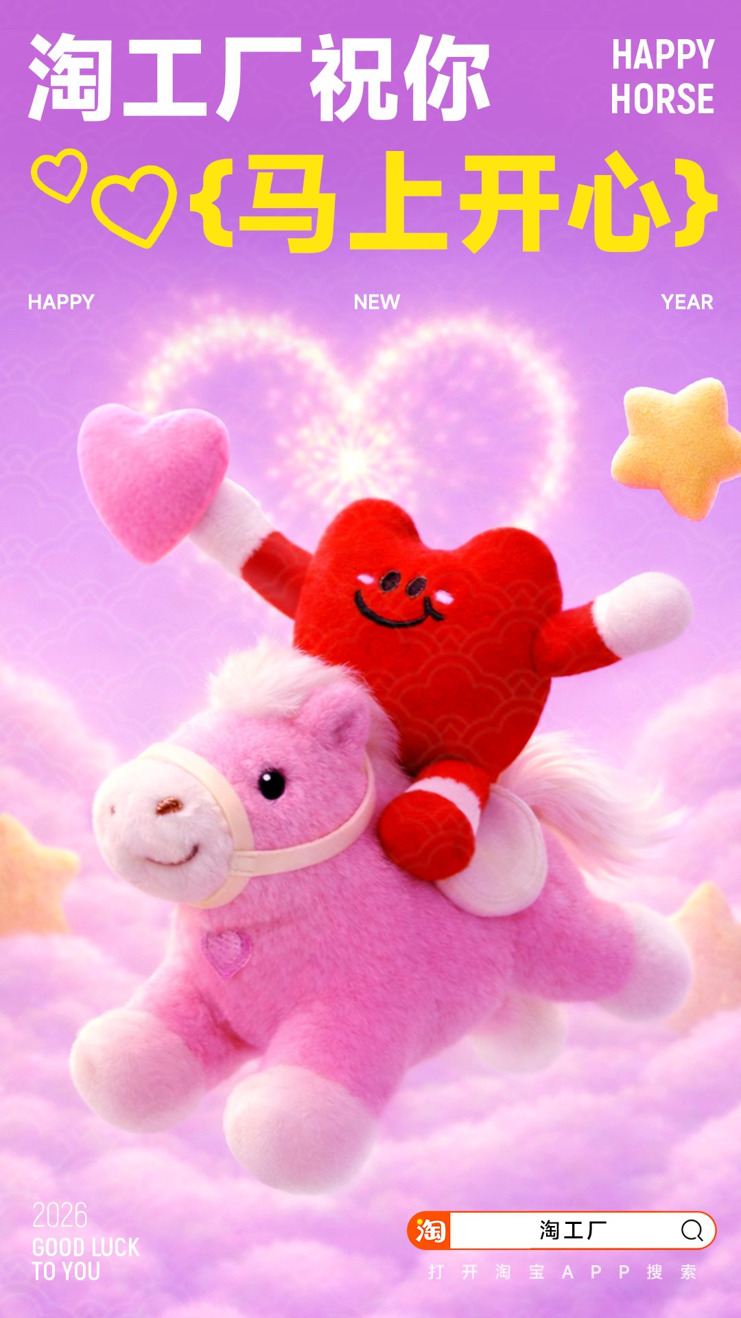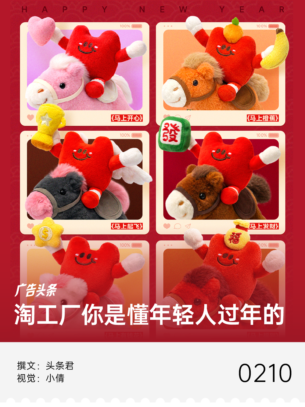 要真正走进年轻群体,离不开对情绪的洞察、对个性的尊重,用有温度、有创意的互动与他们玩在一起。淘工厂以“马上好运”IP 拿捏了年轻人的新年情绪,又通过深耕产业带,在年货节期间带来高性价比的源头好货,既传递了“年轻、有趣、有活力”的品牌形象,又以实打实的优质供给满足了年轻人的年货需求,让淘工厂成为年轻人囤年货的首选地,更持续拉近了品牌与年轻消费者的距离。
