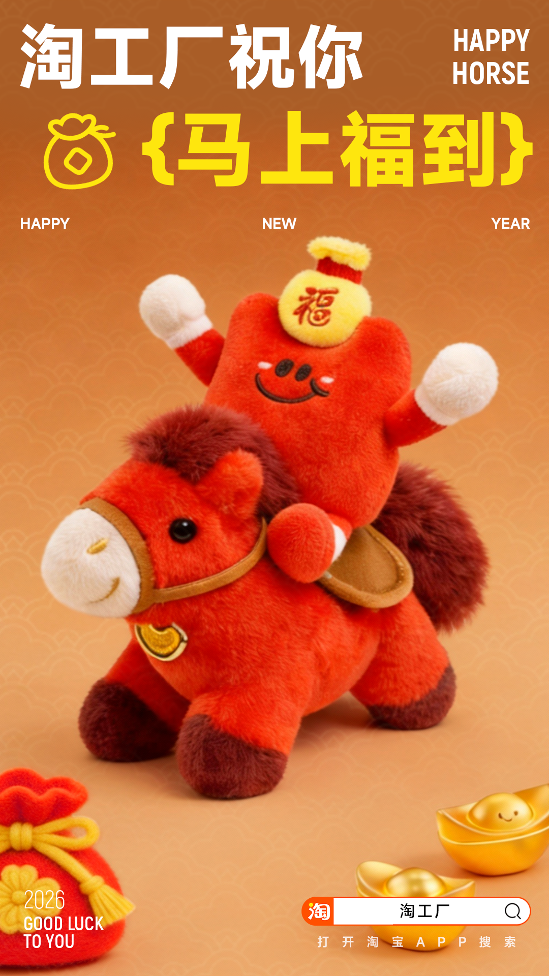 其实,小马驮着淘气包的造型,还藏着“马上淘工厂”的小彩蛋,囤年货的当下,上淘工厂,既能解锁马年好运,还能挖到超多高性价比源头好货。工厂直供,没有中间商赚差价,所有产品都来自中国本土产业带,吃的、穿的、用的,方方面面都覆盖到了,既能保证品质,价格还香到离谱,主打一个“低价高质”,囤年货性价比直接拉满!