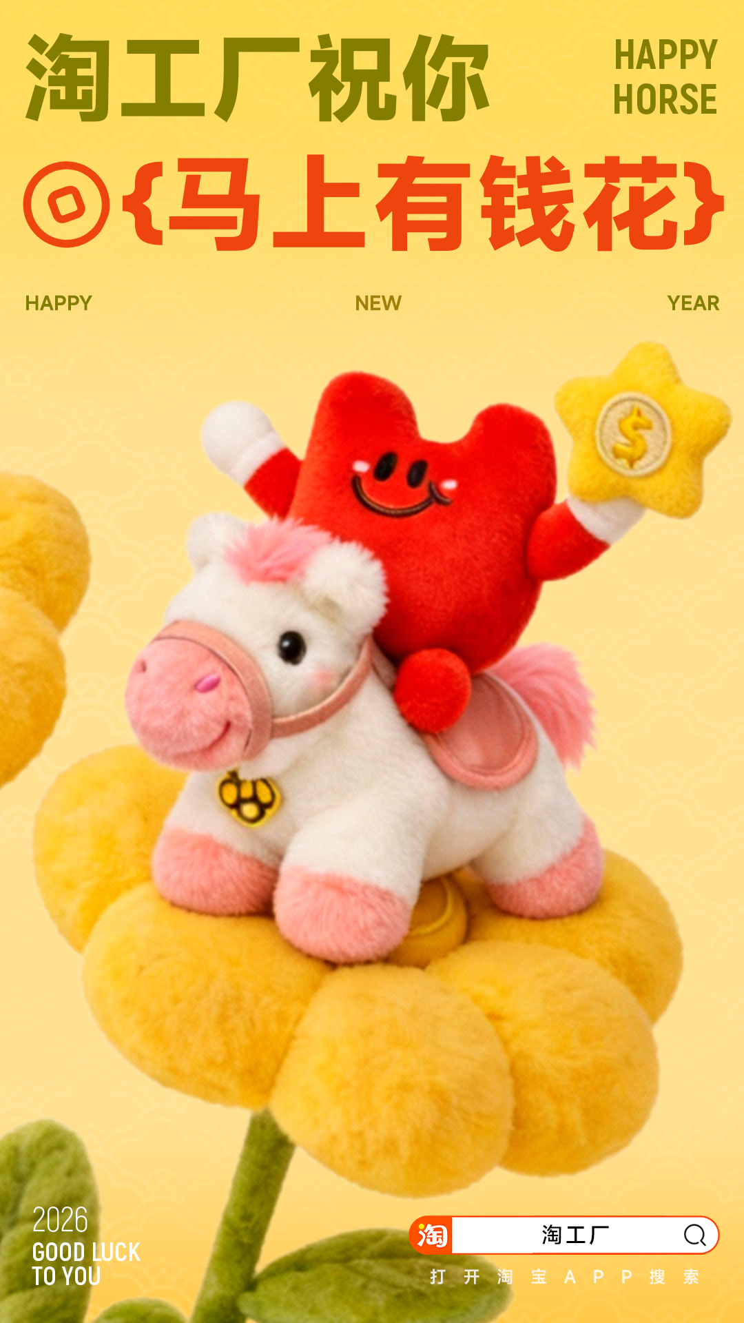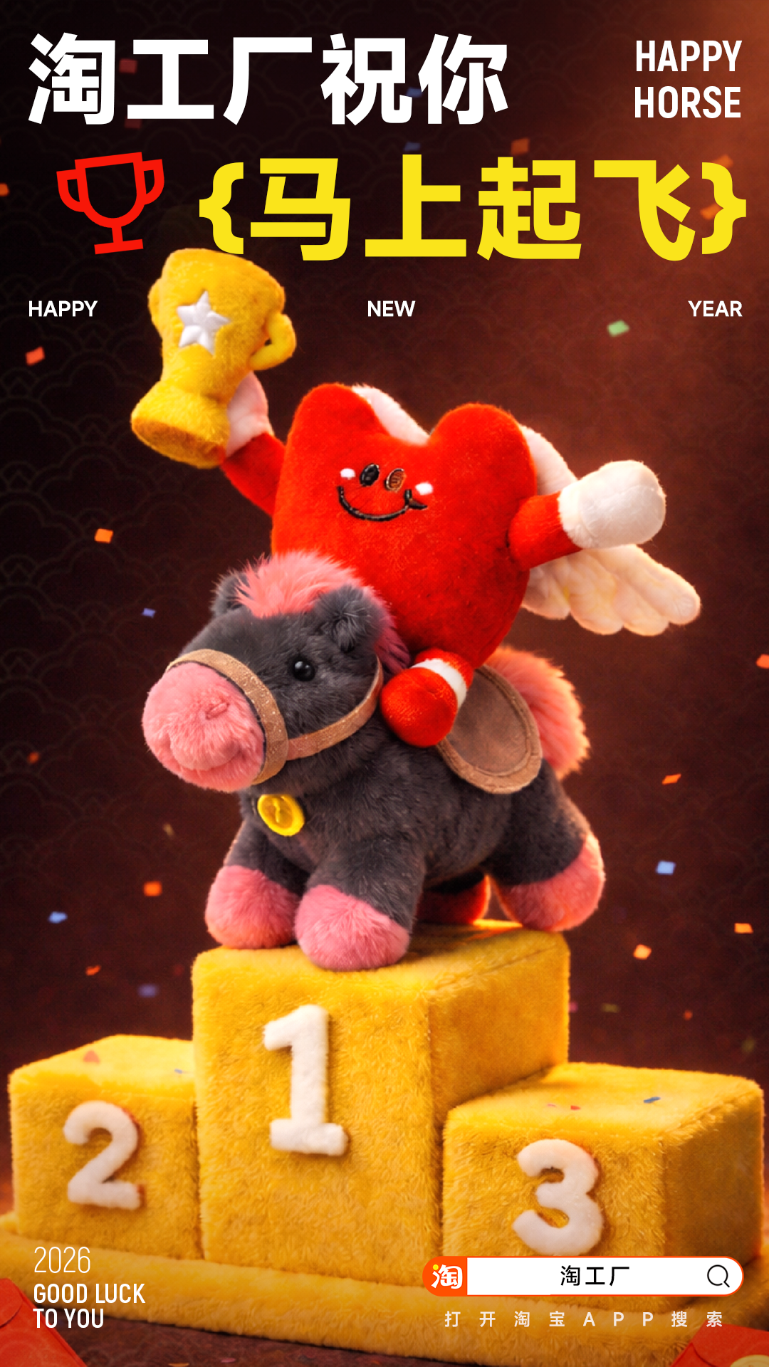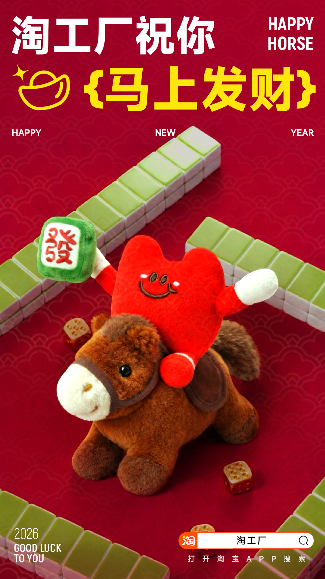 一向会玩的淘工厂,精准捕捉到了这份对“好运”的渴望,把马年的好寓意、好彩头,做成了一组“小马驹”,既是穿搭配饰,也能解锁马年好运玄学,拿捏了 Z 世代的社交需求。
