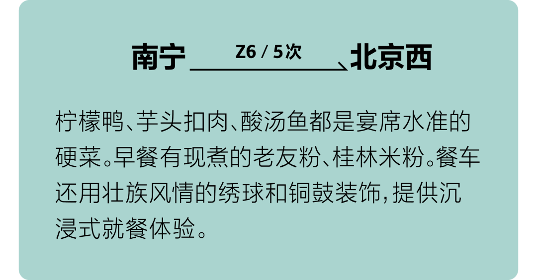 Z6次(南宁 — 北京西)的芋头扣肉也是他的硬核安慰剂,荔浦芋头绵密粉糯,蒸过的扣肉并不肥腻,反而将油脂的香润浸润给芋头,层层铺叠,每次端上桌都令人食指大动。不过由于一个人吃饭,不方便点多,他还未尝到柠檬鸭的滋味,“我不知道 T8 还能跑多久,车厢比我年纪都要大了。”藻虾说,“又是吃一次少一次的餐车。”
