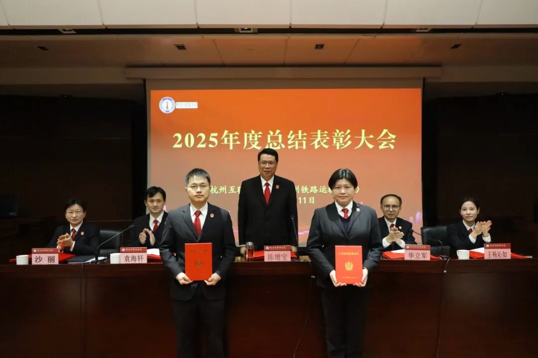 为全面贯彻落实党的二十大和二十届历次全会精神,深学笃行习近平法治思想,认真贯彻中央全面依法治国工作会议及近期中央、省市委和上级法院重要会议精神,全面回顾总结过去一年经验成效,表彰先进、分析形势和不足,进一步动员全院上下坚定扛起“全国模范法院”责任担当,坚持“走在前、作示范”的标准定位,锚定“四个一流”,谋划部署2026年工作,在全面推进互联网司法改革创新上更进一步、更上一层,2月11日上午,杭州互联网法院(杭州铁路运输法院)召开2025年度工作总结表彰大会。党组书记、院长陈增宝出席会议并讲话,党组成员、副院长华立军主持会议,院领导和全院干警参加会议。
