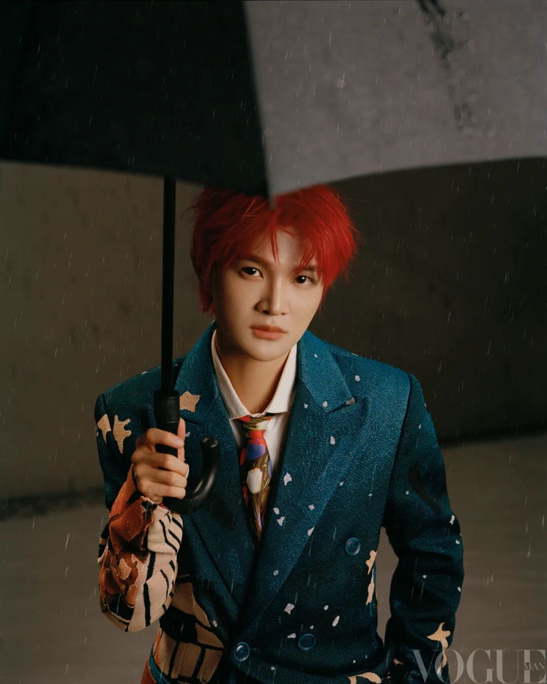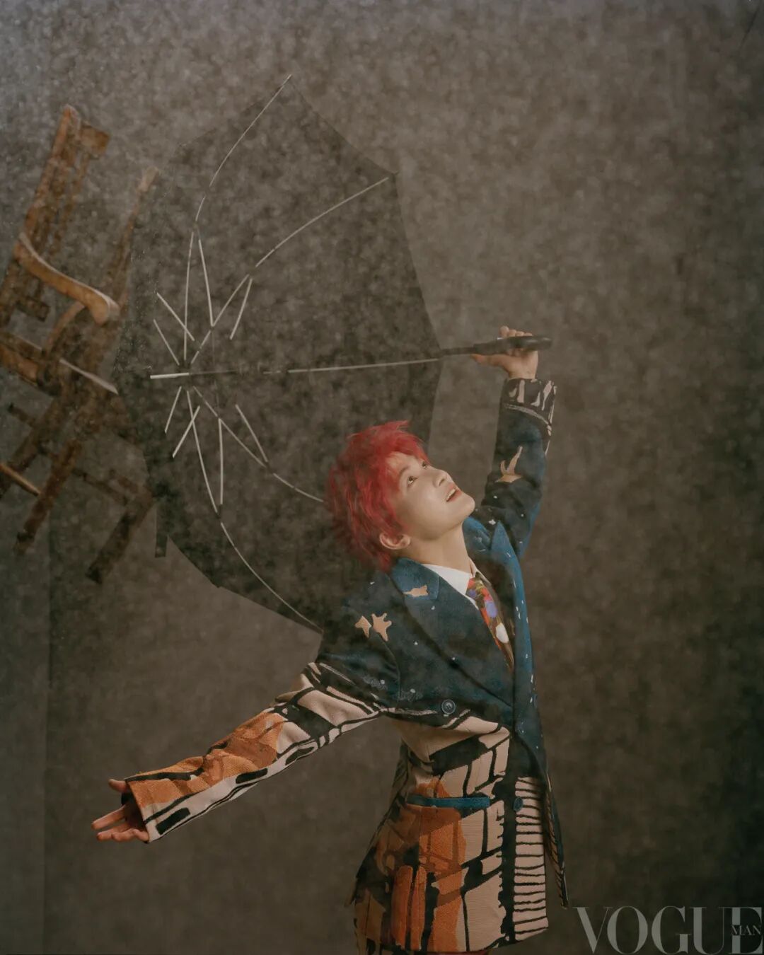 艺术涂鸦西装外套、艺术涂鸦西装裤 均为KidSuper;白色衬衫 Paul Smith;黑色乐福鞋 Kenzo;领带 Vintage