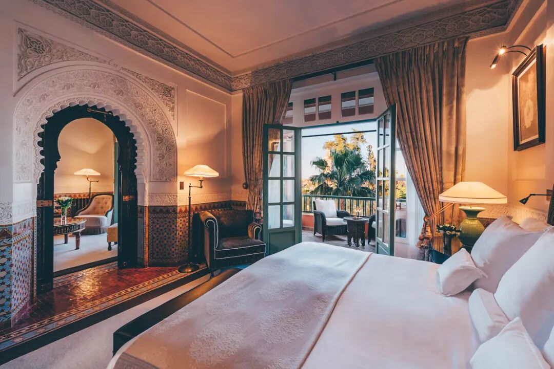 La Mamounia 位于马拉喀什,是一座自 1920 年代开业的传奇奢华酒店,融合了摩洛哥传统建筑与装饰艺术。酒店套房延续摩洛哥的工艺特色,让家具、织物与色彩饱含地域的韵味。套房配有宽敞的露台,可将库图比亚清真寺的剪影、酒店园林及远处的阿特拉斯山脉尽收眼底。室内布局自然流畅,客厅与卧室的过渡舒适,使得空间温馨而雅致。