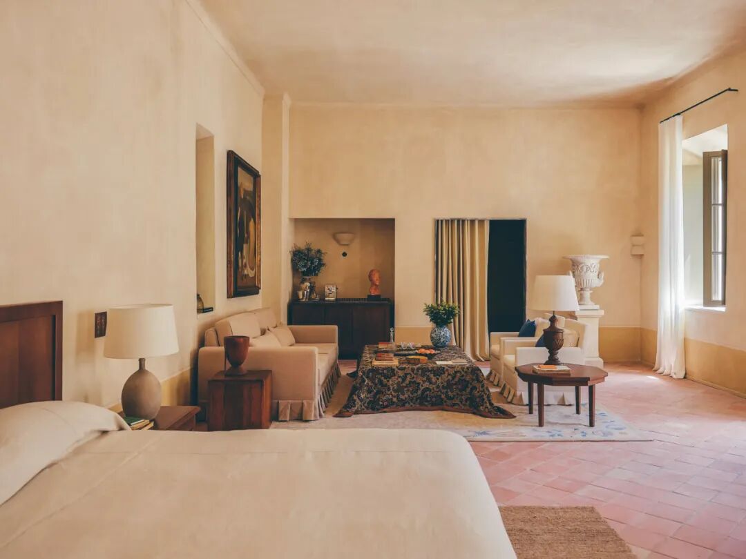 酒店的套房延续了修道院原本的克制与宁静。厚实的石墙、拱形的门楣和木质的百叶窗都被完整地保留下来,整体空间不追求奢华的堆砌,而是强调光线与比例。有些套房设有独立客厅、露台或小花园,窗外就是老城错落的屋顶,天气晴好时还能远望至海面。房间里没有电视,取而代之的是书籍、手工家具和安静的氛围,让人更专注当下的体验。