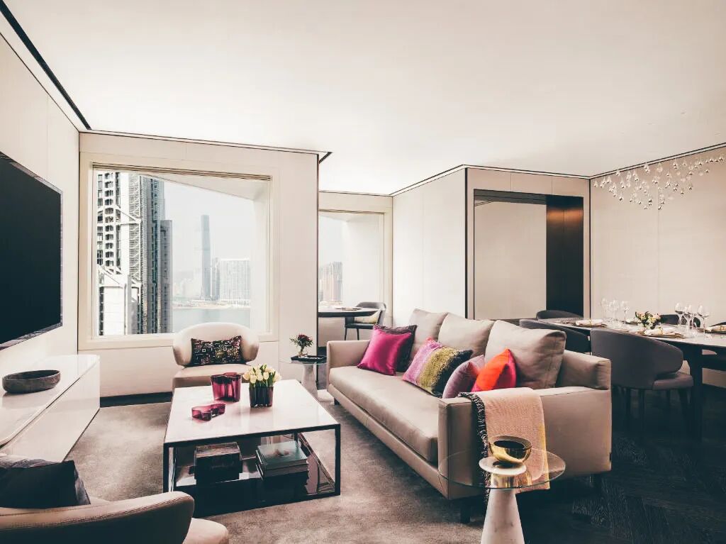 套房位于高层,225 平方米的空间通过宽阔的落地窗,将中环、金钟一带的城市景观铺展开来。窗外远处是不断生长的城市天际线,近处则是绿意环绕的公园与道路,远处又能看到高楼与山景的交错;白天理性克制,夜晚灯火渐亮,历史与现代在此处的视野中并存。