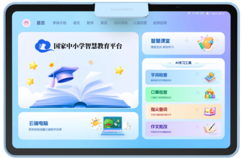 校园场景下,产品以普惠平板为核心终端,打造AI互动教室、AI自习室,集成11万国家优质教学资源,通过AI智能批改、学情分析等功能,实现课前备课、课中互动、课后精准辅导的全流程赋能,目前产品已在多所学校落地应用,有效提升教学效率。
