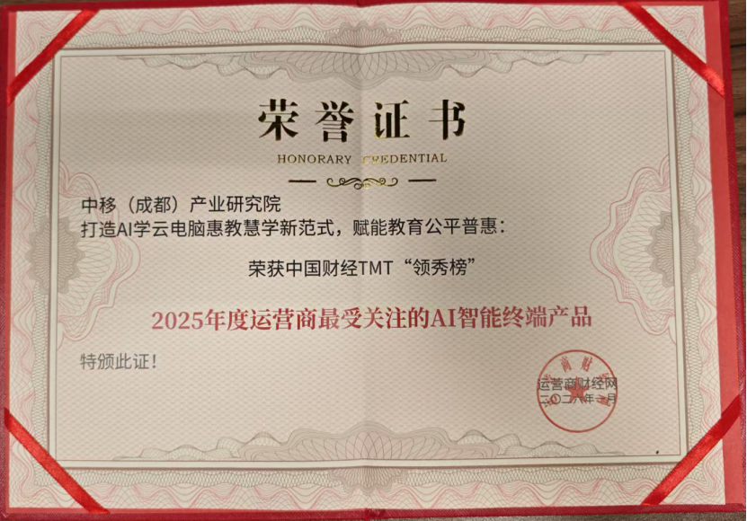 近日,由运营商财经网主办的2026年中国财经TMT“领秀榜”评选结果揭晓,中国移动(成都)产业研究院(以下简称“成研院”)联合中国移动政企事业部、中国移动云能力中心打造的AI学云电脑,荣获“2025年度运营商最受关注的AI智能终端产品”奖。这一认可,既是行业对成研院技术研发与产品落地实力的肯定,也是对成研院深耕教育数字化、践行普惠教育理念的鼓励。