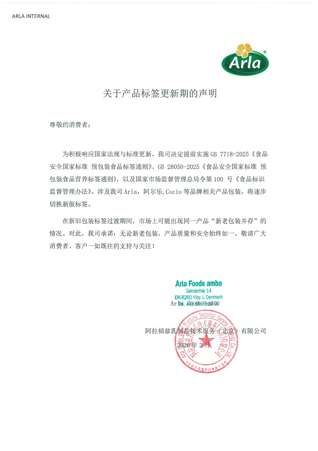 我司旗下Arla阿尔乐、Cocio可酷优、Lurpak银宝、Castello嘉仕德罗等品牌相关产品,将逐步切换至新版标签包装。新旧包装过渡期间,市场上可能出现同一产品新老包装并行销售的情况。