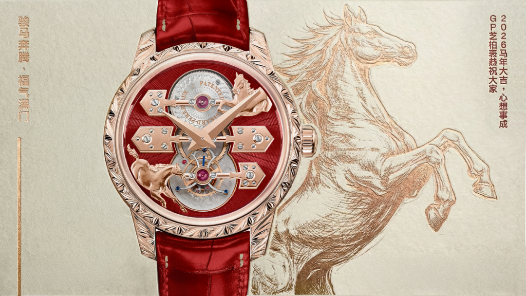 值此丙午新岁,GP芝柏表携焰红"神秘骏马"献上诚挚祝福——愿您事业腾飞如骏马踏云,家庭和睦似骏马归巢,健康常伴若骏马矫健。GP芝柏表谨以凝汇品牌逾235年时光匠心的传奇三金桥陀飞轮腕表献礼马年新春,它源自1867年由康士坦特先生首创的传奇三金桥陀飞轮怀表,以三根平行板桥将精妙机械化为视觉诗篇。。金质雕刻骏马驰骋于发条盒与陀飞轮板桥之间,与表圈及表耳处精心雕琢的金质叶片纹饰交相辉映,寓意新岁前程似锦、叶茂春华。