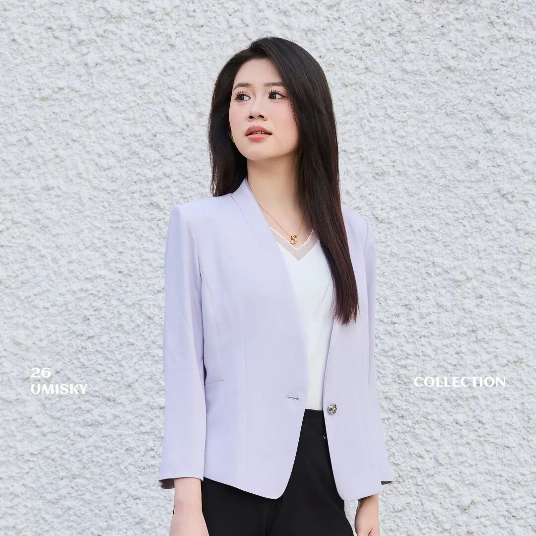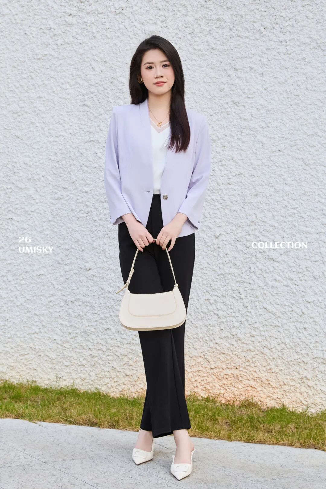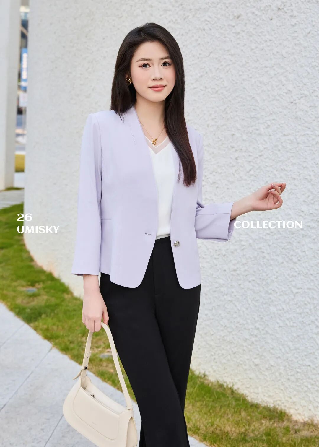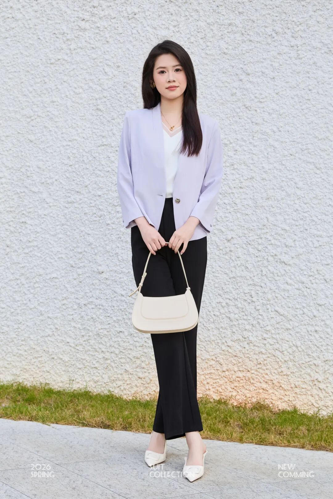 浅紫西装自带温柔滤镜,无领版型弱化职场严肃感,与黑色裤装形成柔刚碰撞。一抹淡紫唤醒节后沉寂心绪,告别慵懒,以轻盈姿态奔赴新职场挑战。