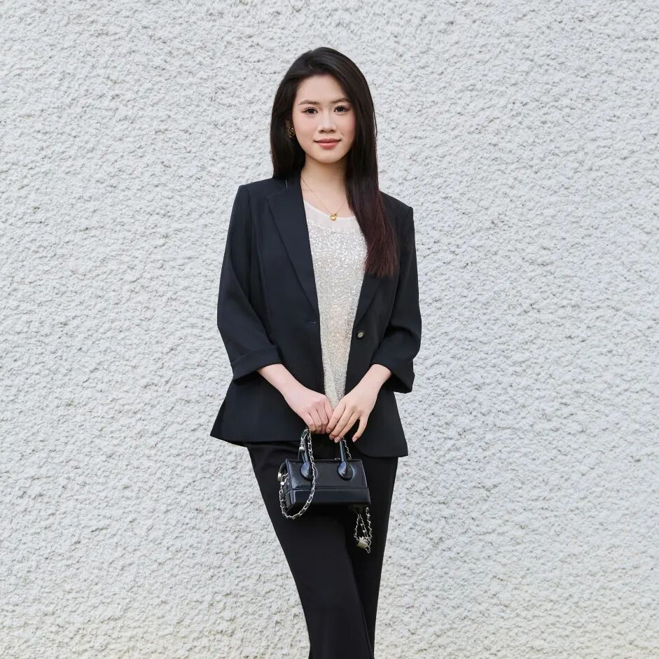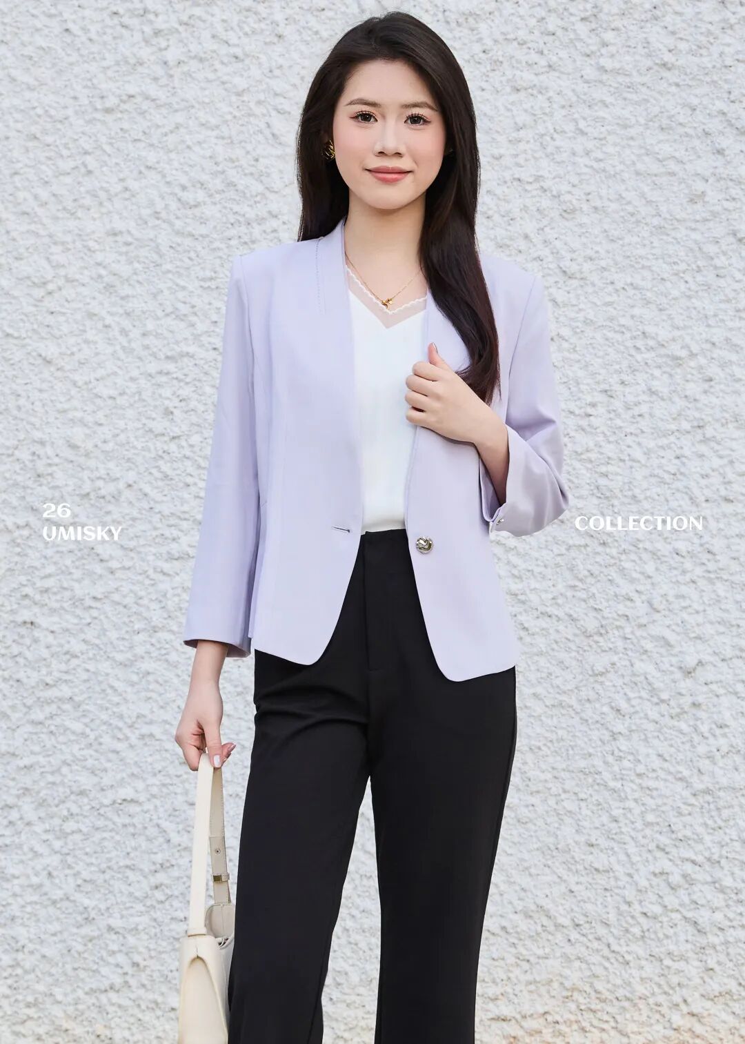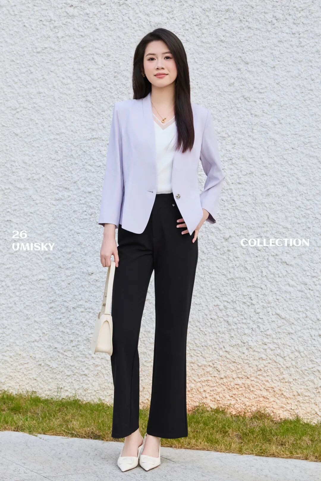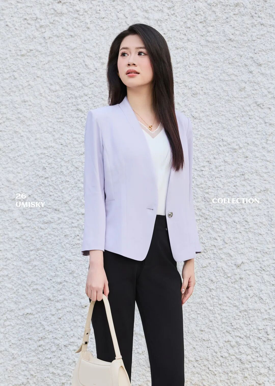 浅紫西装自带温柔滤镜,无领版型弱化职场严肃感,与黑色裤装形成柔刚碰撞。一抹淡紫唤醒节后沉寂心绪,告别慵懒,以轻盈姿态奔赴新职场挑战。