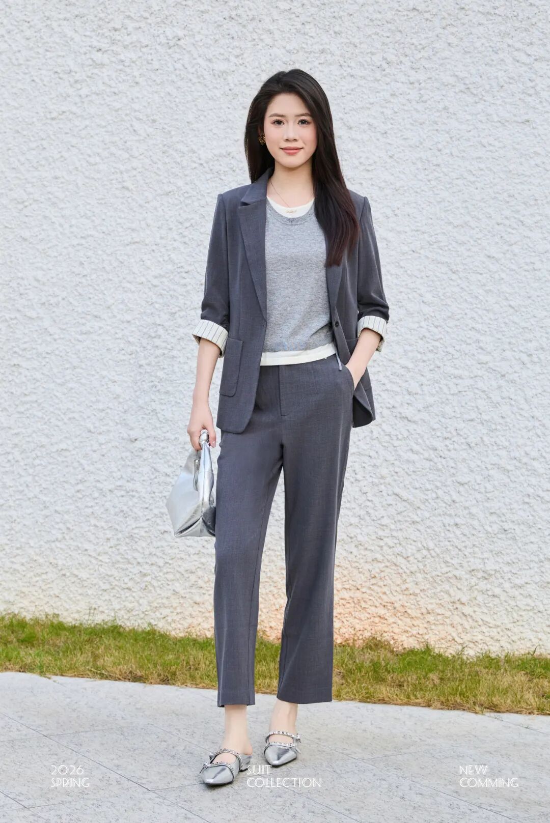 深浅交错的灰,是思维清晰的视觉映射。一身精炼合体的剪裁,无需多余装饰,已自成气场。晨间高效会议的标配,利落、自信、一切尽在掌控。