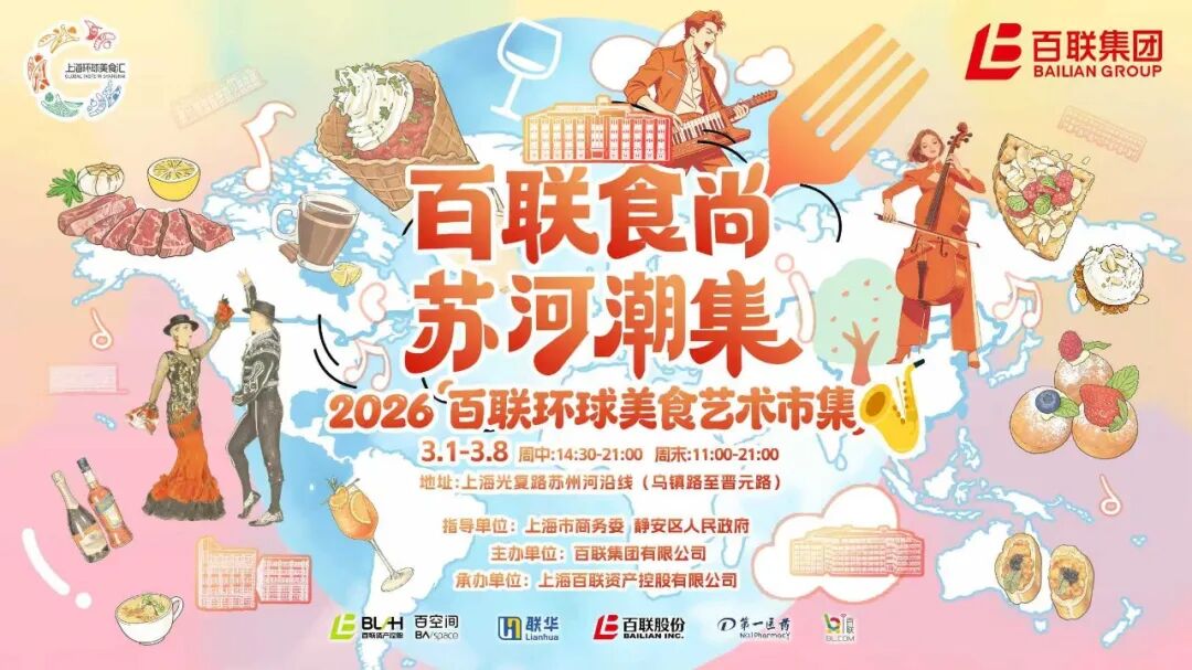 3月1日至8日,“百联食尚·苏河潮集”——2026百联环球美食艺术市集将在光复路苏州河沿线(乌镇路至晋元路)热闹开市,打破传统市集单一消费模式,将异国风味、艺术展演、新品首发、沉浸式互动融为一体,在滨水空间打造兼具美学气质与消费活力的城市新地标,让市民在赏景、逛集、品食的过程中,感受世界美食文化与海派生活方式的交融碰撞。