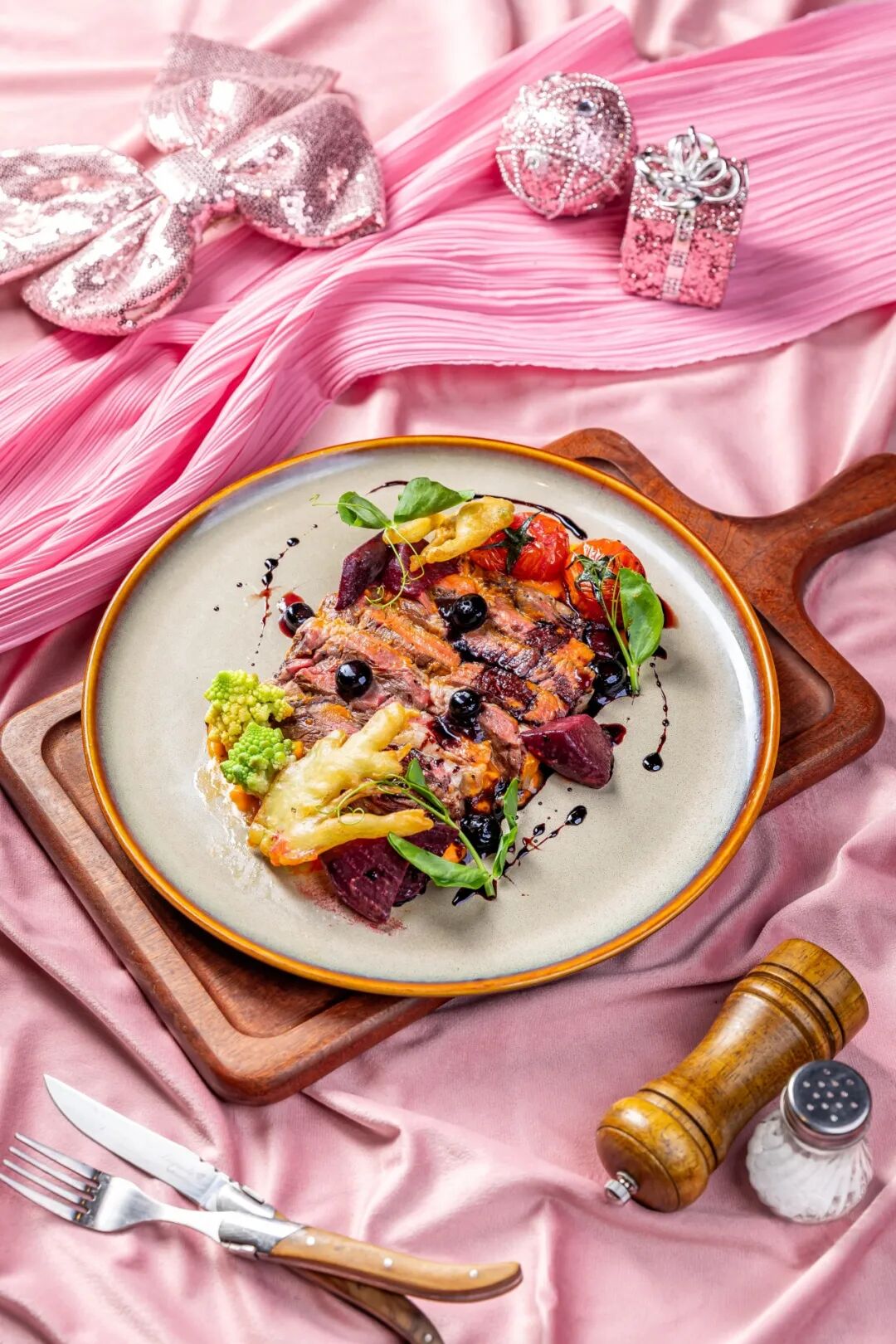 Premium rib-eye steak, grilled to a perfect crisp on the outside and tender on the inside. A rich cinnamon red wine blends seamlessly with the tartness of fresh blueberries, creating a loving and delightful culinary feast.