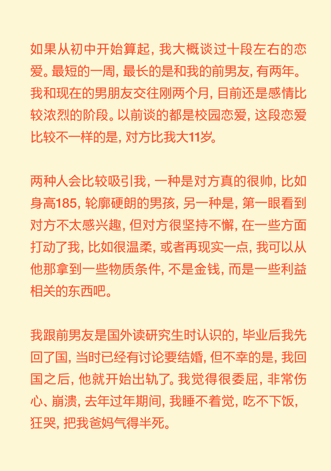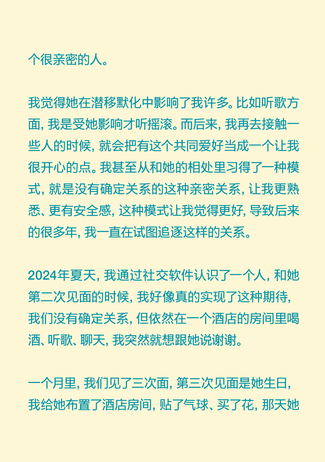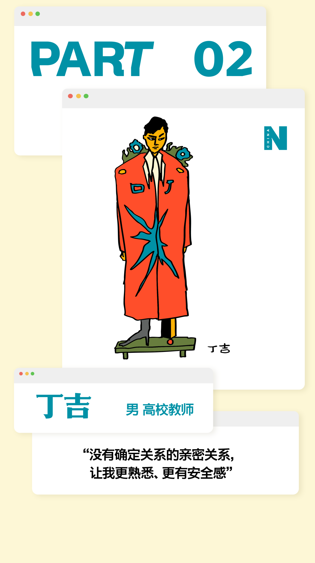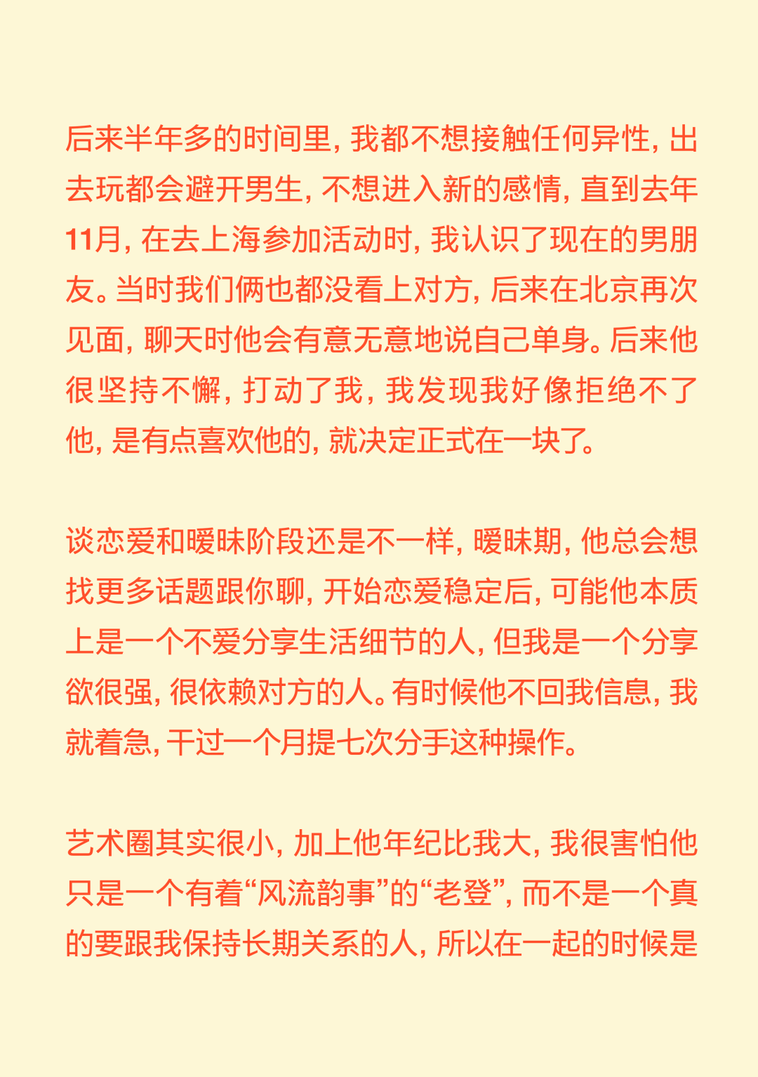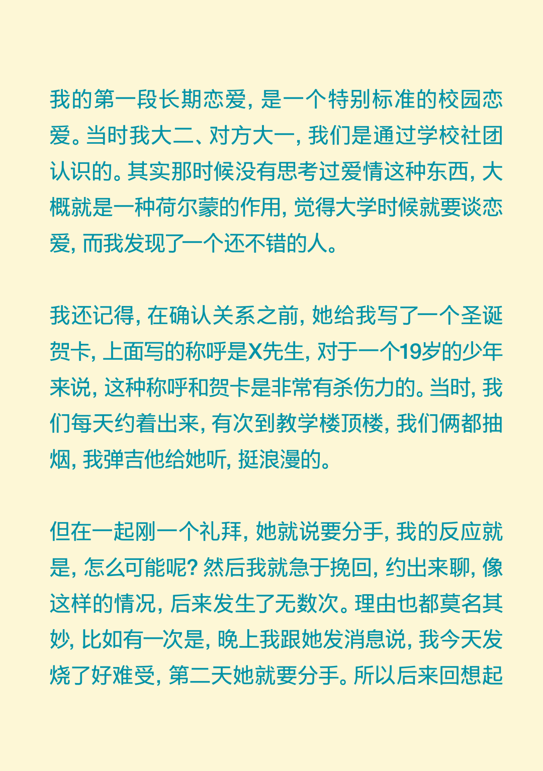 你爱得再浓烈,也不过是抛物线! You Can’t Love Outside the Parabola 导语:“我好像从来没有感受过那种喜欢与日俱增的感受,都是一开始容易产生一些不切实际的期待,最后慢慢下降。确认关系前三四天的那个拉扯阶段,可能是我恋爱抛物线的顶点。” 正文: 在这个追求“稳定”的时代,没什么比爱情更让人感觉“不稳定”了。 你不得不承认,每段爱情都有波动的轨迹,有充满能量的上升期,有令人眩晕的最高点,也自然会有平静滑落的阶段。如同谢霆锋在《香水》里唱:“你爱再浓烈也是条抛物线。” 在情人节千篇一律的甜蜜轰炸里,我们想提供一种更深入、更真实、也更治愈的共鸣。我们采访了三位年轻人,从他们的故事中,我们很难将这一代年轻人的感情观归类为“冒险”还是“理性”。但全情投入,再抽身离去,是这代年轻人对爱情最清醒的领悟。 而爱的价值,不仅在于停留在顶峰,更在于那段真诚划过的、完整的轨迹。 Agnes 女 媒体人 “我好像从来没有对一个人越来越喜欢” 我成年后的第一个恋爱对象,是一个比我大8岁的人,当时我20岁,他是我弟弟的钢琴老师。再一次放假回国的时候,我瞒着家里人和他领了证。他是有点“男妈妈”的类型,很爱“伺候”我,做饭很好吃。留学那几年,我大事小事都没自己干过,超市都不需要我自己去。 但后来,可能确实年龄差距太大,两个人生活不在同一个阶段,经常吵架的时候特别难受,每天都很烦躁。当时我就想赶紧回国,赶紧离婚。当时真的没把结婚当成特别大的事情,反正领证的事情身边人都不知道,也没有办婚礼。可能对当时的我来说,办婚礼才是真正的社会意义上的结婚。 在旁观者看来,他们肯定会说,“这人绝对不行。”但当时,我就是发自内心的觉得这人行不行无所谓,我在他身上也得到了我想要的价值。 后来我也谈了几个男朋友,我的前任们大多是比较聪明、机灵的人,想法比较多。我喜欢那种自己有些独特经历、有一些艺术气息的男生。 我理想的恋爱状态是,两个人玩得特别好,你想干什么他都能陪着你,而且是发自内心的想陪我。我一个前男友,是那种我提出什么要求他从来不会拒绝,但是他总是特别疲惫,一看到他满脸丧气的样子,我就什么兴致都没有了。我现在的男朋友就是,我们比较能玩到一起去,就算他很累,你一说去打牌,他立刻两眼放光。 听起来,可能我还停留在找人一起玩的阶段,怎么这么浅薄?但确实仔细想想,这些年连一个好的玩伴都没找到。 冷暴力是我最好的武器。我特别擅长冷战,大家都能感受到这个房间里有大象,但我就是不说。当对方性格比较直接的时候,他就会觉得这种冷暴力特别难以忍受。但这可能也是我表达不满的一种方式,我能知道,这是他不想要的,所以我才会这样。这或许也是我谈恋爱时,总会激怒对方的原因。去年,我和前任因为一次冷战,最后吵架、摔东西闹到了派出所。 我们家是那种不太擅长表达情绪的家庭,我爸妈有点像合作伙伴,印象中他们都不是那种特别会过日子、感情特别紧密、会大家一起坐下来聊一些事情的那种夫妻。所以我感觉,我自己对于表达情感可能也有点抵触。 但这两年我发现,只要你愿意表达同理心,有沟通的意愿,其实还是能收获到意想不到的价值。其实每段关系开始前,我都是奔着长期相处的想法去谈的,但是很快,可能只是一两个月,你就会发现这个人身上的一些缺点,我就意识到,可能处不下去了。一点小事,我就会很失望,觉得不行了。但有时候,暂时也没找到下一个合适的,觉得这样处着也无所谓。 我相信爱情本身,但我感觉它发生在身上的几率好像变得比以前少了。我感觉人和人相处,最难的部分就是一直保持耐心,生活中你可能有乱七八糟的事情,每次出现的问题都不一样,但如果你有耐心,两个人总是能解决的。但我特别容易失去耐心,各种问题,也就不会再有什么商量的余地。 我好像从来没有感受过那种喜欢与日俱增的感受,都是一开始容易产生一些不切实际的期待,最后慢慢下降。确认关系前三四天的那个拉扯阶段,可能是我恋爱抛物线的顶点。 丁吉 男 高校教师 “没有确定关系的亲密关系,让我更熟悉、更有安全感” 我的第一段长期恋爱,是一个特别标准的校园恋爱。当时我大二、对方大一,我们是通过学校社团认识的。其实那时候没有思考过爱情这种东西,大概就是一种荷尔蒙的作用,觉得大学时候就要谈恋爱,而我发现了一个还不错的人。 我还记得,在确认关系之前,她给我写了一个圣诞贺卡,上面写的称呼是X先生,对于一个19岁的少年来说,这种称呼和贺卡是非常有杀伤力的。当时,我们每天约着出来,有次到教学楼顶楼,我们俩都抽烟,我弹吉他给她听,挺浪漫的。 但在一起刚一个礼拜,她就说要分手,我的反应就是,怎么可能呢?然后我就急于挽回,约出来聊,像这样的情况,后来发生了无数次。理由也都莫名其妙,比如有一次是,晚上我跟她发消息说,我今天发烧了好难受,第二天她就要分手。所以后来回想起来,我也会觉得这并不是一个很健康的关系。那时候还不流行PUA这个词,就是单纯地觉得很折磨。 整个大学期间,大部分时光都是我们两个人度过的,也有一些浪漫的记忆。比如我们那当时都很穷,一起出去旅游,坐一晚上硬座,她就一直靠在我身上到天亮。还有一次我们去湖边,我骑车带她,走了很远的路,有二三十公里,像一个青春版的