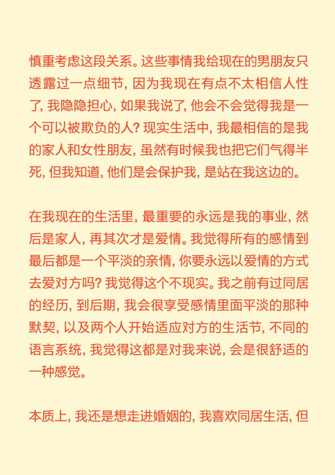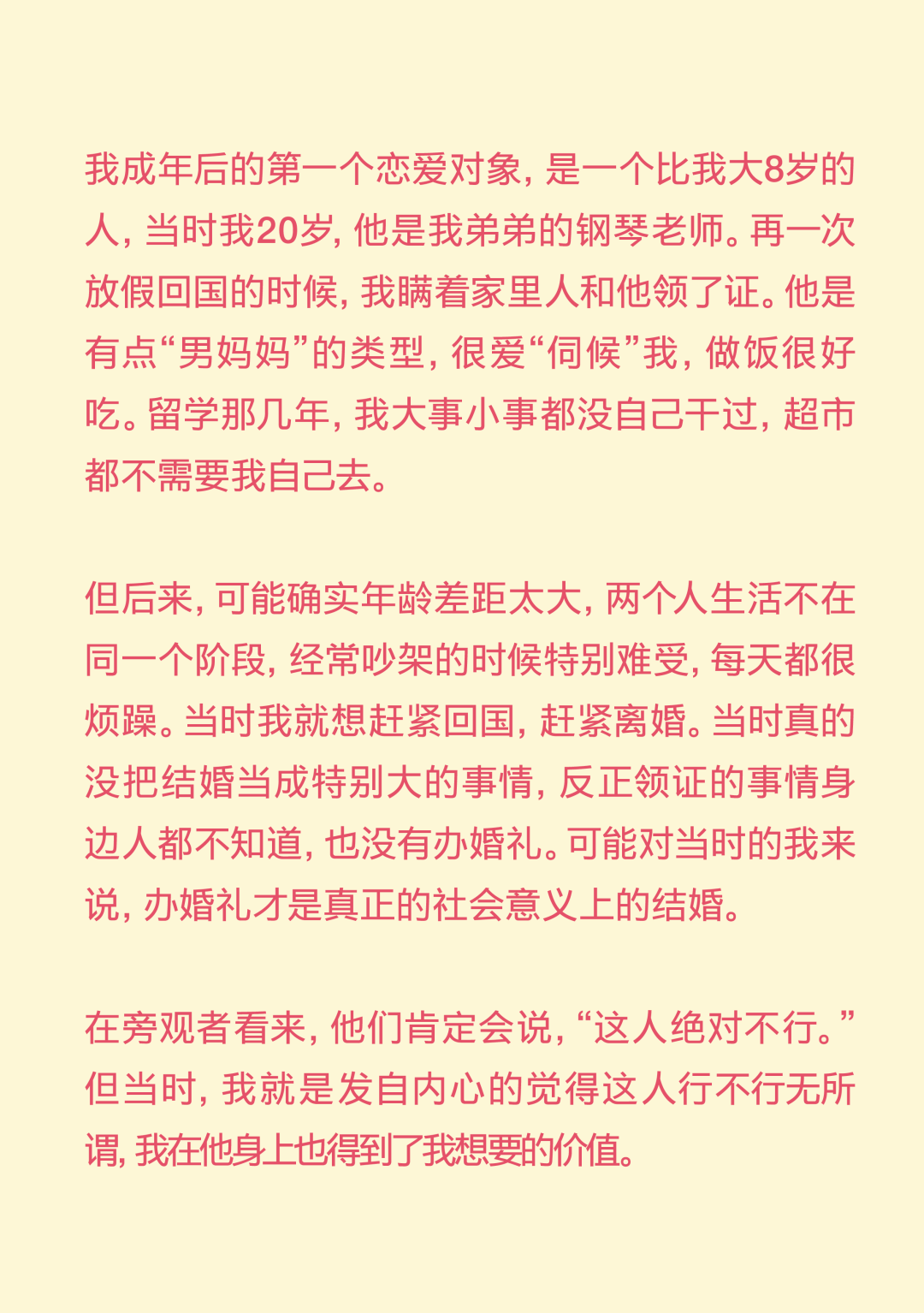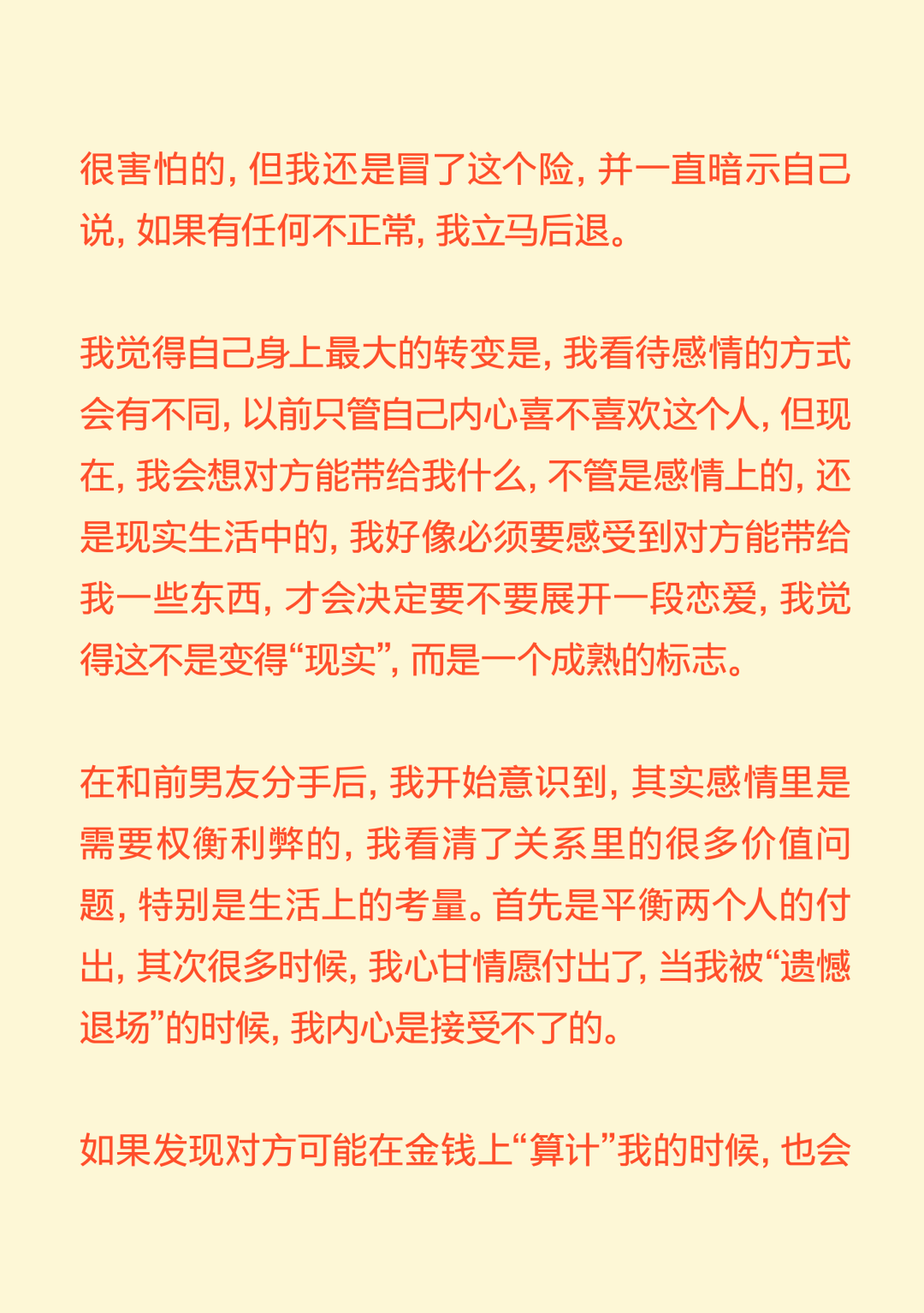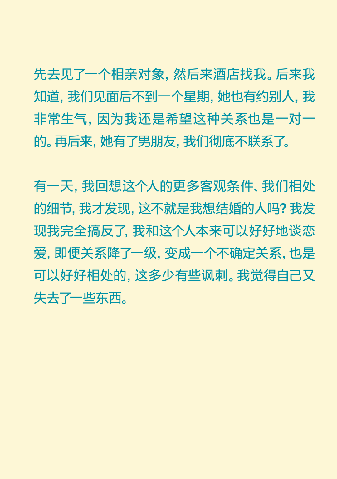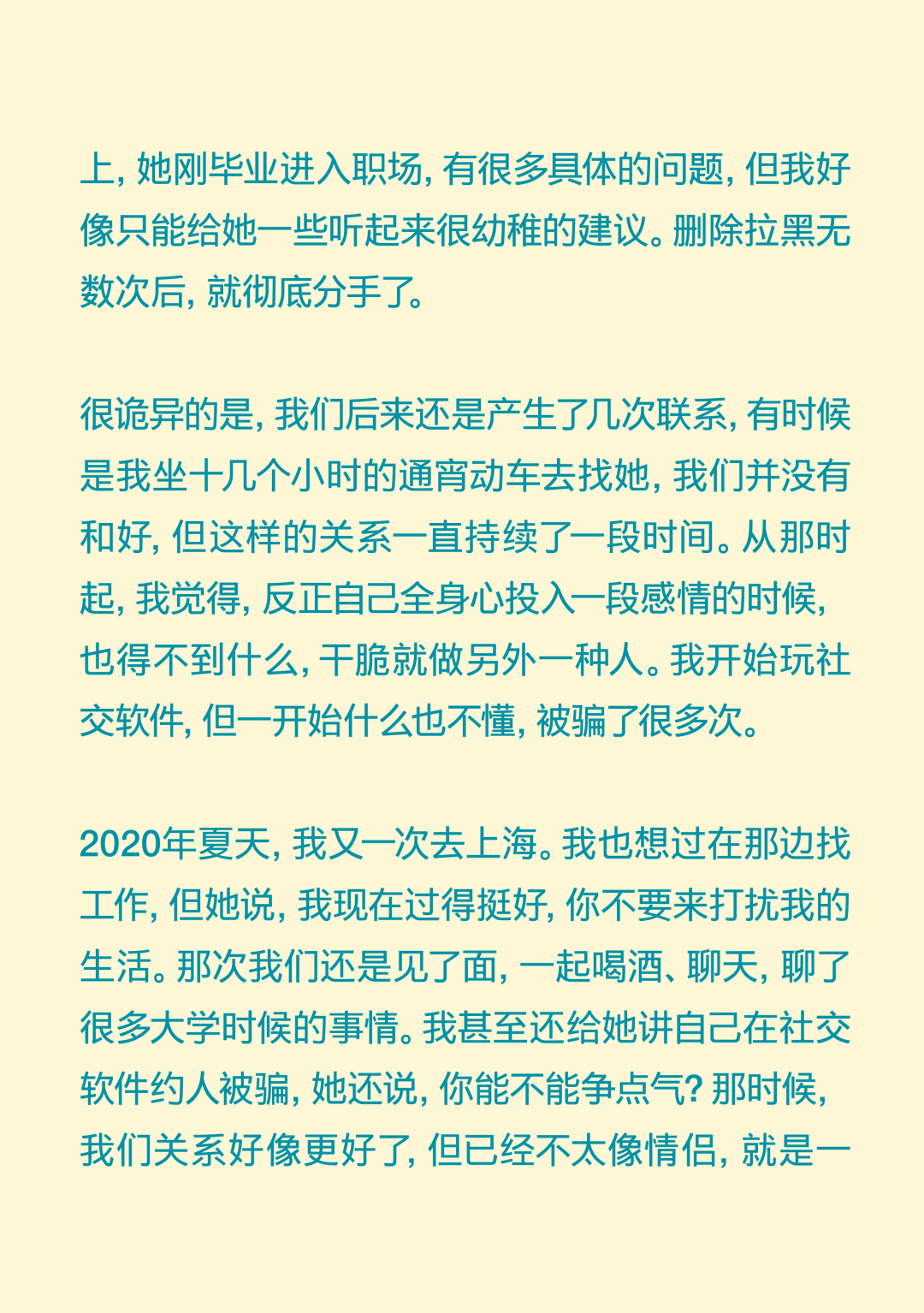 你爱得再浓烈,也不过是抛物线! You Can’t Love Outside the Parabola 导语:“我好像从来没有感受过那种喜欢与日俱增的感受,都是一开始容易产生一些不切实际的期待,最后慢慢下降。确认关系前三四天的那个拉扯阶段,可能是我恋爱抛物线的顶点。” 正文: 在这个追求“稳定”的时代,没什么比爱情更让人感觉“不稳定”了。 你不得不承认,每段爱情都有波动的轨迹,有充满能量的上升期,有令人眩晕的最高点,也自然会有平静滑落的阶段。如同谢霆锋在《香水》里唱:“你爱再浓烈也是条抛物线。” 在情人节千篇一律的甜蜜轰炸里,我们想提供一种更深入、更真实、也更治愈的共鸣。我们采访了三位年轻人,从他们的故事中,我们很难将这一代年轻人的感情观归类为“冒险”还是“理性”。但全情投入,再抽身离去,是这代年轻人对爱情最清醒的领悟。 而爱的价值,不仅在于停留在顶峰,更在于那段真诚划过的、完整的轨迹。 Agnes 女 媒体人 “我好像从来没有对一个人越来越喜欢” 我成年后的第一个恋爱对象,是一个比我大8岁的人,当时我20岁,他是我弟弟的钢琴老师。再一次放假回国的时候,我瞒着家里人和他领了证。他是有点“男妈妈”的类型,很爱“伺候”我,做饭很好吃。留学那几年,我大事小事都没自己干过,超市都不需要我自己去。 但后来,可能确实年龄差距太大,两个人生活不在同一个阶段,经常吵架的时候特别难受,每天都很烦躁。当时我就想赶紧回国,赶紧离婚。当时真的没把结婚当成特别大的事情,反正领证的事情身边人都不知道,也没有办婚礼。可能对当时的我来说,办婚礼才是真正的社会意义上的结婚。 在旁观者看来,他们肯定会说,“这人绝对不行。”但当时,我就是发自内心的觉得这人行不行无所谓,我在他身上也得到了我想要的价值。 后来我也谈了几个男朋友,我的前任们大多是比较聪明、机灵的人,想法比较多。我喜欢那种自己有些独特经历、有一些艺术气息的男生。 我理想的恋爱状态是,两个人玩得特别好,你想干什么他都能陪着你,而且是发自内心的想陪我。我一个前男友,是那种我提出什么要求他从来不会拒绝,但是他总是特别疲惫,一看到他满脸丧气的样子,我就什么兴致都没有了。我现在的男朋友就是,我们比较能玩到一起去,就算他很累,你一说去打牌,他立刻两眼放光。 听起来,可能我还停留在找人一起玩的阶段,怎么这么浅薄?但确实仔细想想,这些年连一个好的玩伴都没找到。 冷暴力是我最好的武器。我特别擅长冷战,大家都能感受到这个房间里有大象,但我就是不说。当对方性格比较直接的时候,他就会觉得这种冷暴力特别难以忍受。但这可能也是我表达不满的一种方式,我能知道,这是他不想要的,所以我才会这样。这或许也是我谈恋爱时,总会激怒对方的原因。去年,我和前任因为一次冷战,最后吵架、摔东西闹到了派出所。 我们家是那种不太擅长表达情绪的家庭,我爸妈有点像合作伙伴,印象中他们都不是那种特别会过日子、感情特别紧密、会大家一起坐下来聊一些事情的那种夫妻。所以我感觉,我自己对于表达情感可能也有点抵触。 但这两年我发现,只要你愿意表达同理心,有沟通的意愿,其实还是能收获到意想不到的价值。其实每段关系开始前,我都是奔着长期相处的想法去谈的,但是很快,可能只是一两个月,你就会发现这个人身上的一些缺点,我就意识到,可能处不下去了。一点小事,我就会很失望,觉得不行了。但有时候,暂时也没找到下一个合适的,觉得这样处着也无所谓。 我相信爱情本身,但我感觉它发生在身上的几率好像变得比以前少了。我感觉人和人相处,最难的部分就是一直保持耐心,生活中你可能有乱七八糟的事情,每次出现的问题都不一样,但如果你有耐心,两个人总是能解决的。但我特别容易失去耐心,各种问题,也就不会再有什么商量的余地。 我好像从来没有感受过那种喜欢与日俱增的感受,都是一开始容易产生一些不切实际的期待,最后慢慢下降。确认关系前三四天的那个拉扯阶段,可能是我恋爱抛物线的顶点。 丁吉 男 高校教师 “没有确定关系的亲密关系,让我更熟悉、更有安全感” 我的第一段长期恋爱,是一个特别标准的校园恋爱。当时我大二、对方大一,我们是通过学校社团认识的。其实那时候没有思考过爱情这种东西,大概就是一种荷尔蒙的作用,觉得大学时候就要谈恋爱,而我发现了一个还不错的人。 我还记得,在确认关系之前,她给我写了一个圣诞贺卡,上面写的称呼是X先生,对于一个19岁的少年来说,这种称呼和贺卡是非常有杀伤力的。当时,我们每天约着出来,有次到教学楼顶楼,我们俩都抽烟,我弹吉他给她听,挺浪漫的。 但在一起刚一个礼拜,她就说要分手,我的反应就是,怎么可能呢?然后我就急于挽回,约出来聊,像这样的情况,后来发生了无数次。理由也都莫名其妙,比如有一次是,晚上我跟她发消息说,我今天发烧了好难受,第二天她就要分手。所以后来回想起来,我也会觉得这并不是一个很健康的关系。那时候还不流行PUA这个词,就是单纯地觉得很折磨。 整个大学期间,大部分时光都是我们两个人度过的,也有一些浪漫的记忆。比如我们那当时都很穷,一起出去旅游,坐一晚上硬座,她就一直靠在我身上到天亮。还有一次我们去湖边,我骑车带她,走了很远的路,有二三十公里,像一个青春版的
