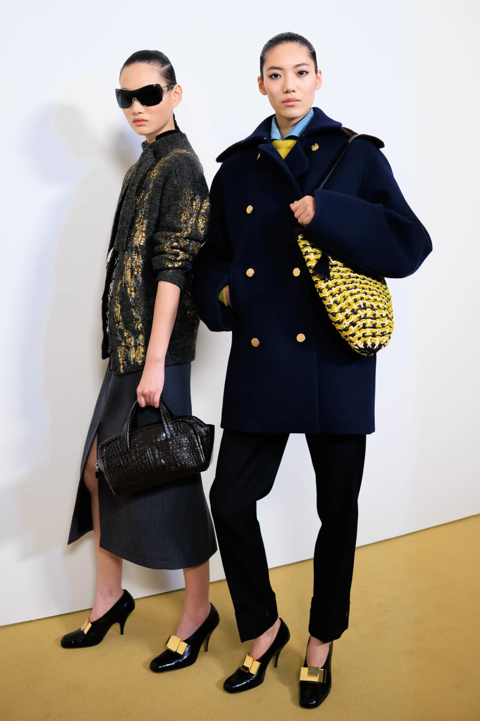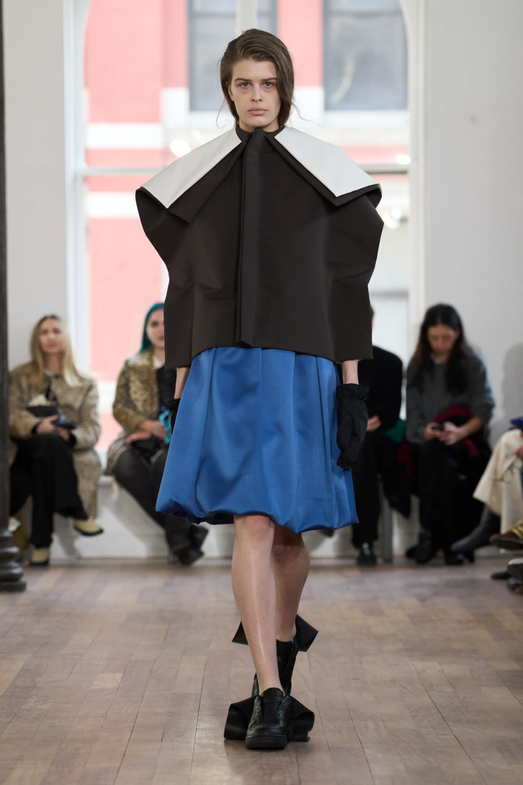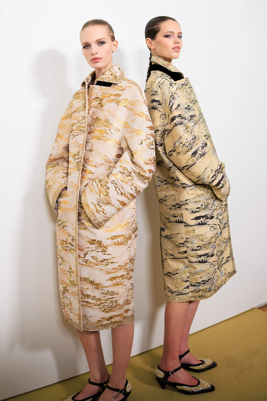 这一切都源于她对“永恒美感”的思考,它或许并不依赖抢眼夺目的宣言式造型,而是依赖日常着装的高质感,以及将看似繁琐华丽的装饰融入日常生活的敏锐洞察力,就像秀场中那两件由金属提花面料打造的茧型大衣,它并不为特定场合而生,而是为了陪伴穿着者走入每一个真实的时刻。