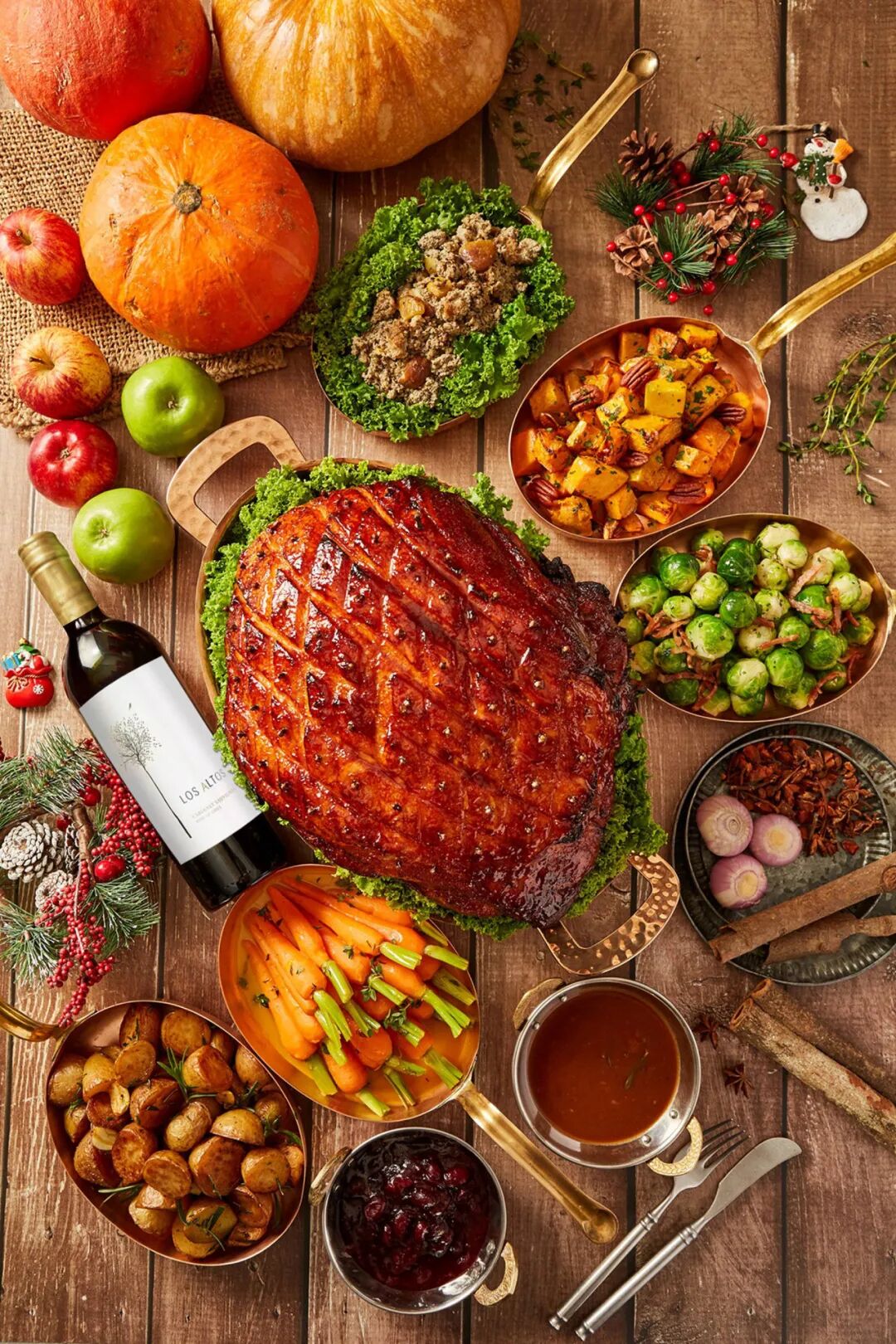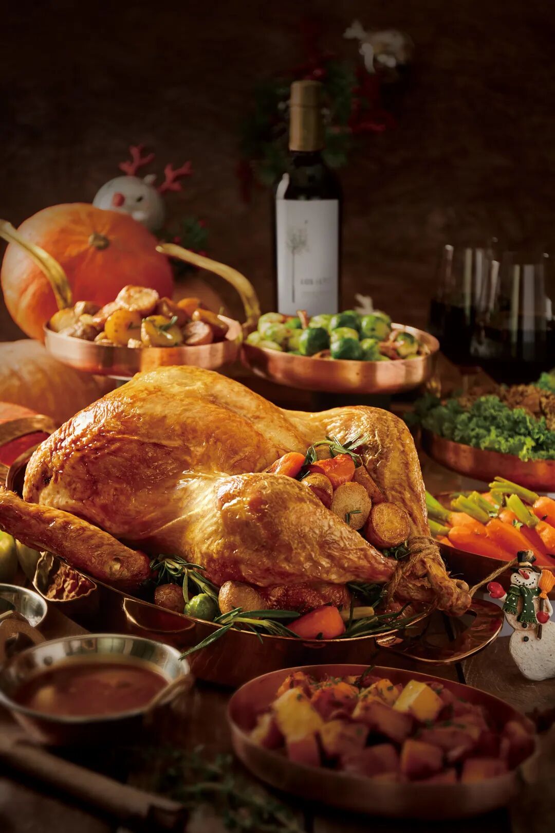 即日起至2024年12月25日,上海静安香格里拉推出节日烤火鸡、特选火腿、火鸡腿共三款外带礼篮以及南瓜派等风味佳肴,为年末的欢聚感恩时刻锦上添花。酒店特选五至八公斤的整只火鸡,使用传统栗子填料,以各式香料腌制后,低温慢烤至火鸡表皮金黄,喷香四溢,再淋上特调的火鸡酱汁,佐以烤迷迭香大蒜土豆、蜂蜜烤白胡桃南瓜、黄油甘蓝等配菜,搭配乐诗途红葡萄酒,丰富的口感激发多重味蕾。