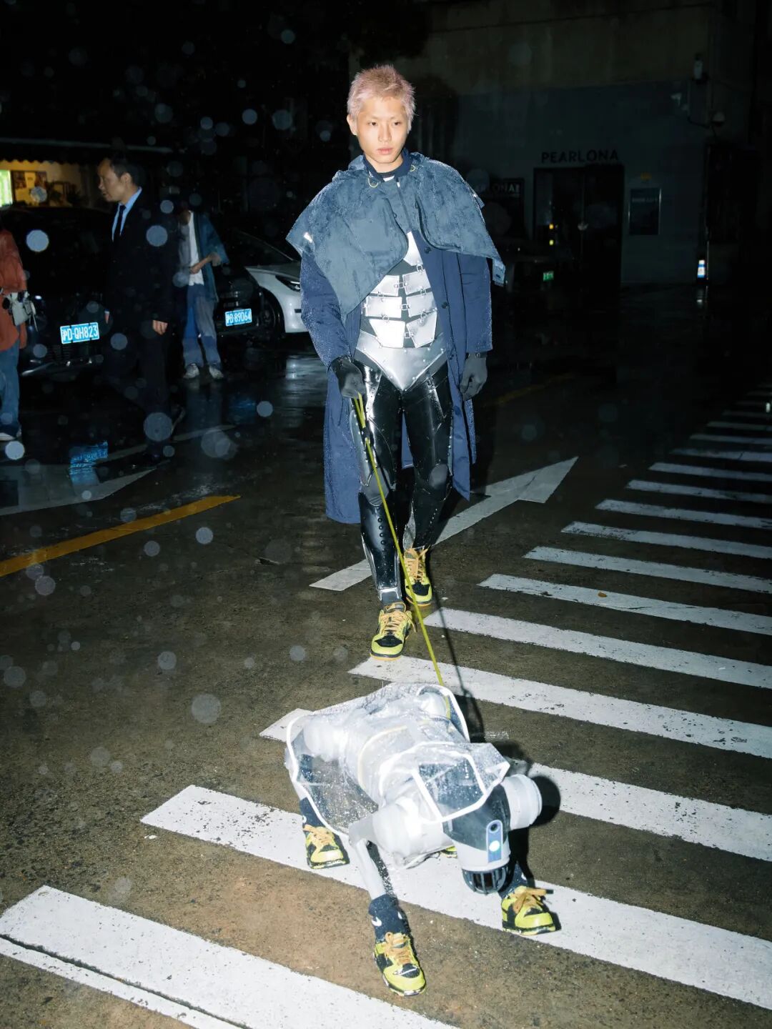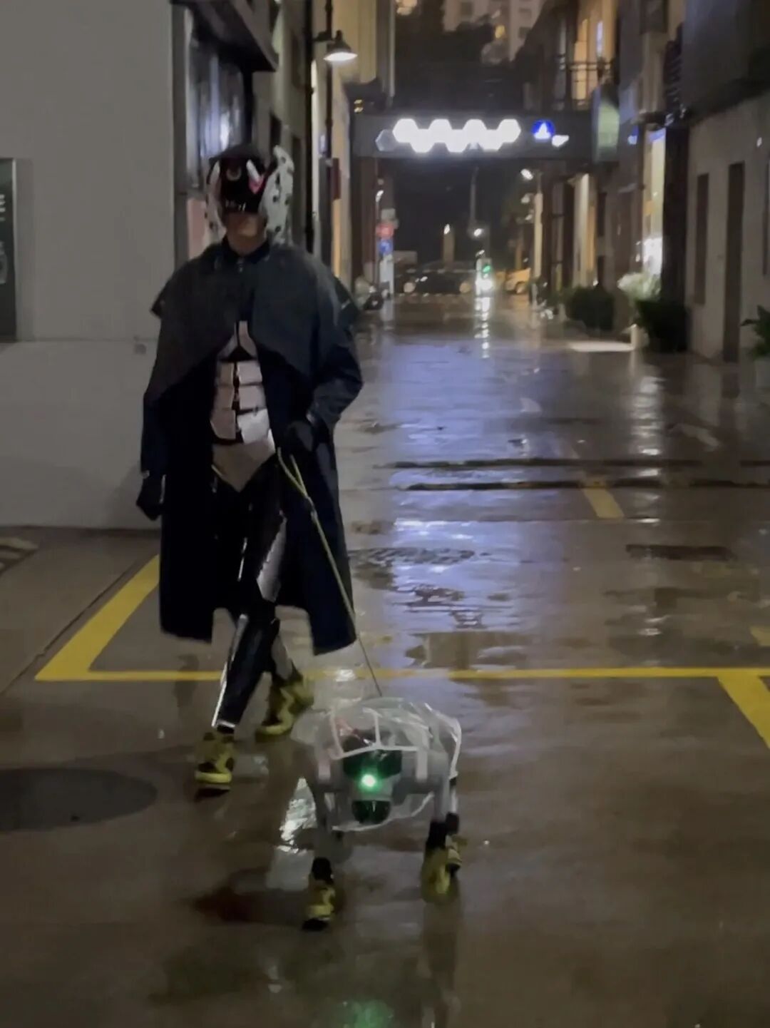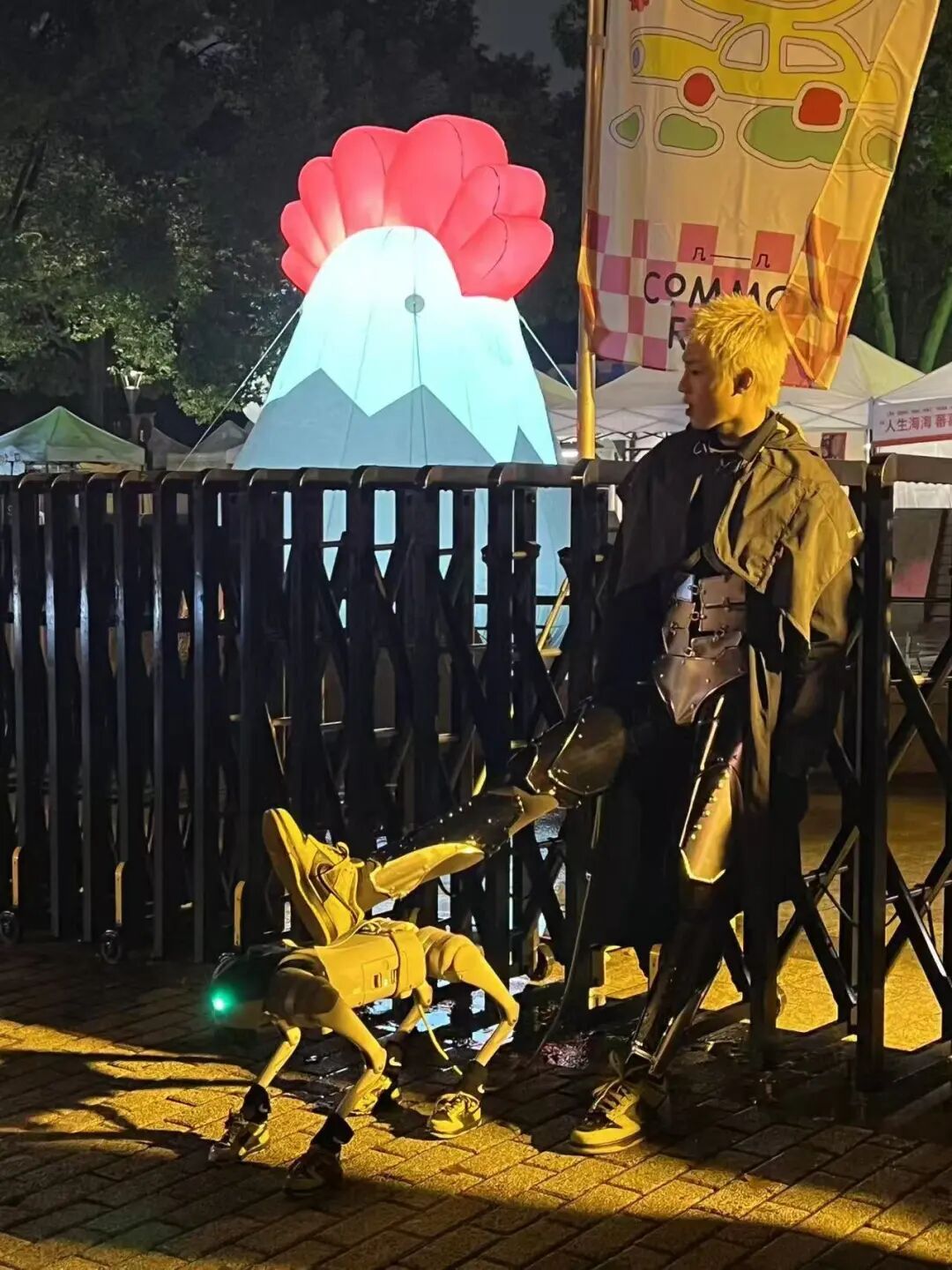 但最让人忍俊不禁的,莫过于这一幕:机器人遛鞋狗。一个机器人coser,带着他科技感十足的机器鞋狗在街头漫步。