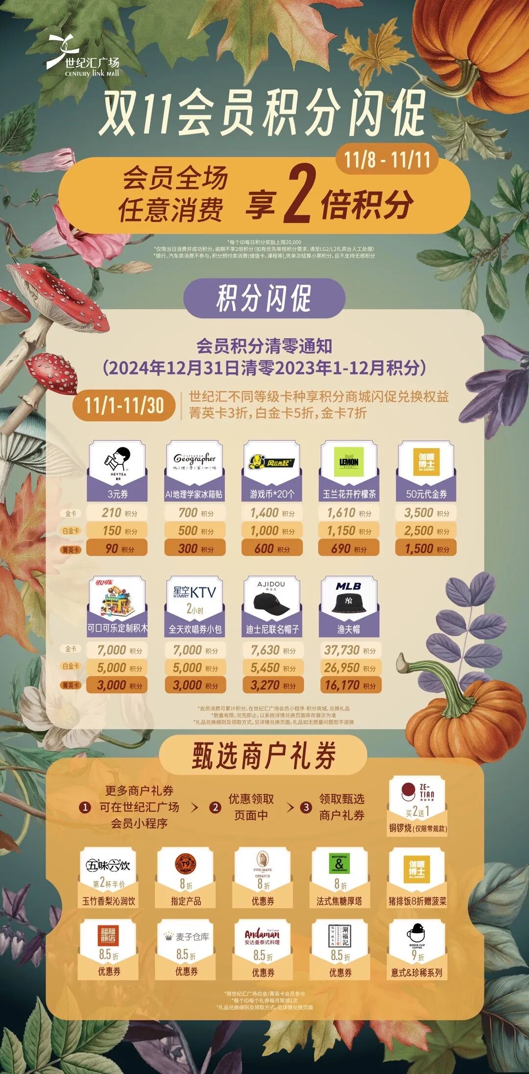 11月1日至11月30日,会员积分商城,积分兑换好礼,世纪汇金卡会员可享受7折优惠;白金卡会员享受5折;菁英卡会员享受3折优惠。