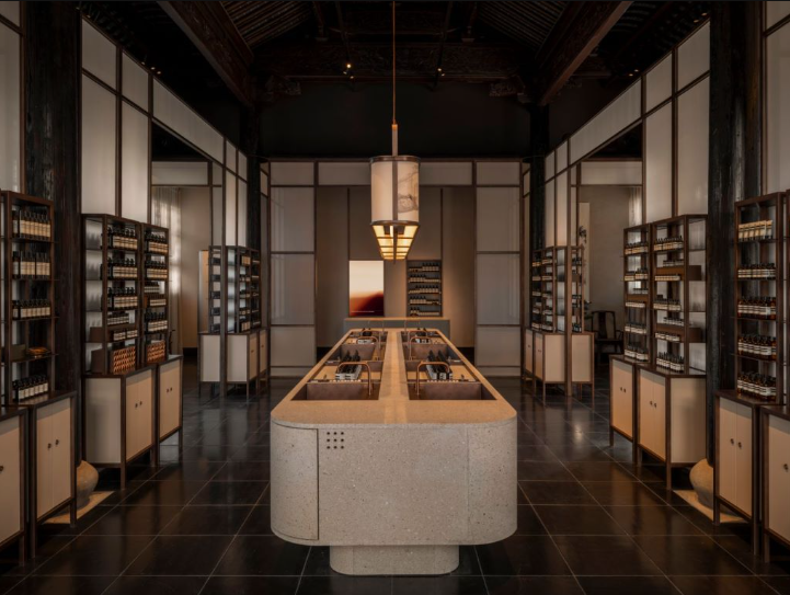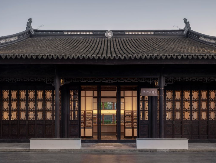 走进Aesop伊索苏州仓街店,如同踏入一幅时光交织的画卷。这家由Aesop伊索设计团队与上海设计工作室Ofmhand Practice携手打造的店铺,和谐演绎了历史建筑与现代空间的诗意美学。在这条承载着姑苏古城记忆的仓街上,品牌特别选址于保存完好的晚清苏式"四面花厅"建筑:厅内的梁柱、屋青上处处可见形态各异又栩栩如生的风凰雕饰,故而得名"风凰厅。这一原本位于干将路上的古迹,曾因城市发展被迫拆除,而后又在本地工匠的悉心修复下重现往日风采。Asop伊案的设计秉持实用主义的现代理念同时展现对原始建筑的深厚敬意,致力守护其历史原貌。