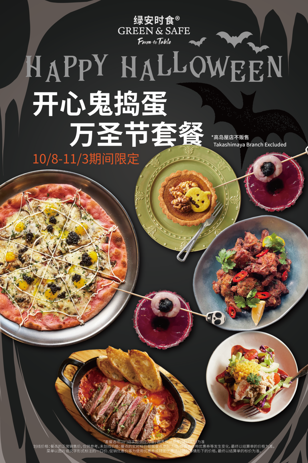 10/8-11/3期间限定【开心鬼捣蛋万圣节套餐399元】,明星菜品【云南松露牛肝菌蘑菇披萨】限时粉色万圣节版,喝上一杯【小恶魔之眼】快乐微醺,再来【开心鬼捣蛋南瓜派】甜蜜收尾,还有众多秋季新品,GREEN & SAFE 陪您一起度过HAPPY HALLOWEEN !