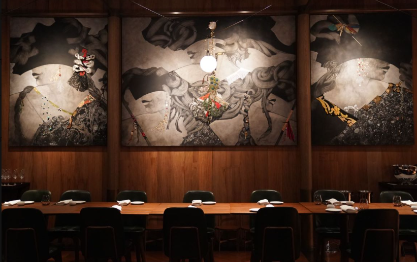 餐厅整体设计为红黑色调的海派风格,璀璨夺目的大型琉璃与亚克力勾勒的红色繁花艺术品,映衬窗外外滩繁华丽景,营造全方位感官盛宴,美馔之旅由此开启。“锦鳞”取自范仲淹的《岳阳楼记》中的“沙鸥翔集,锦鳞游泳。”契合餐厅位于浦江交汇处的同时,亦象征着餐厅秉持传承与现代的交融。