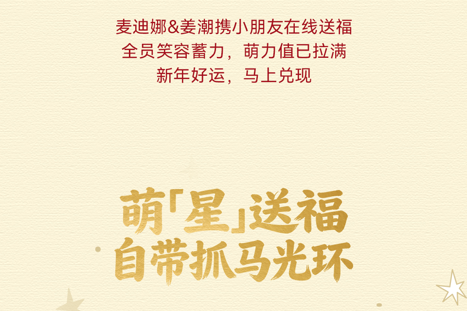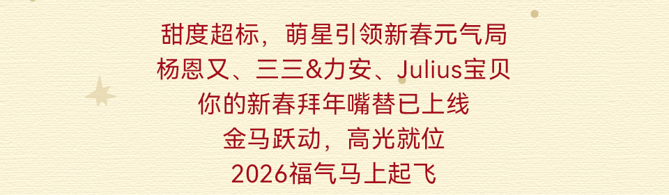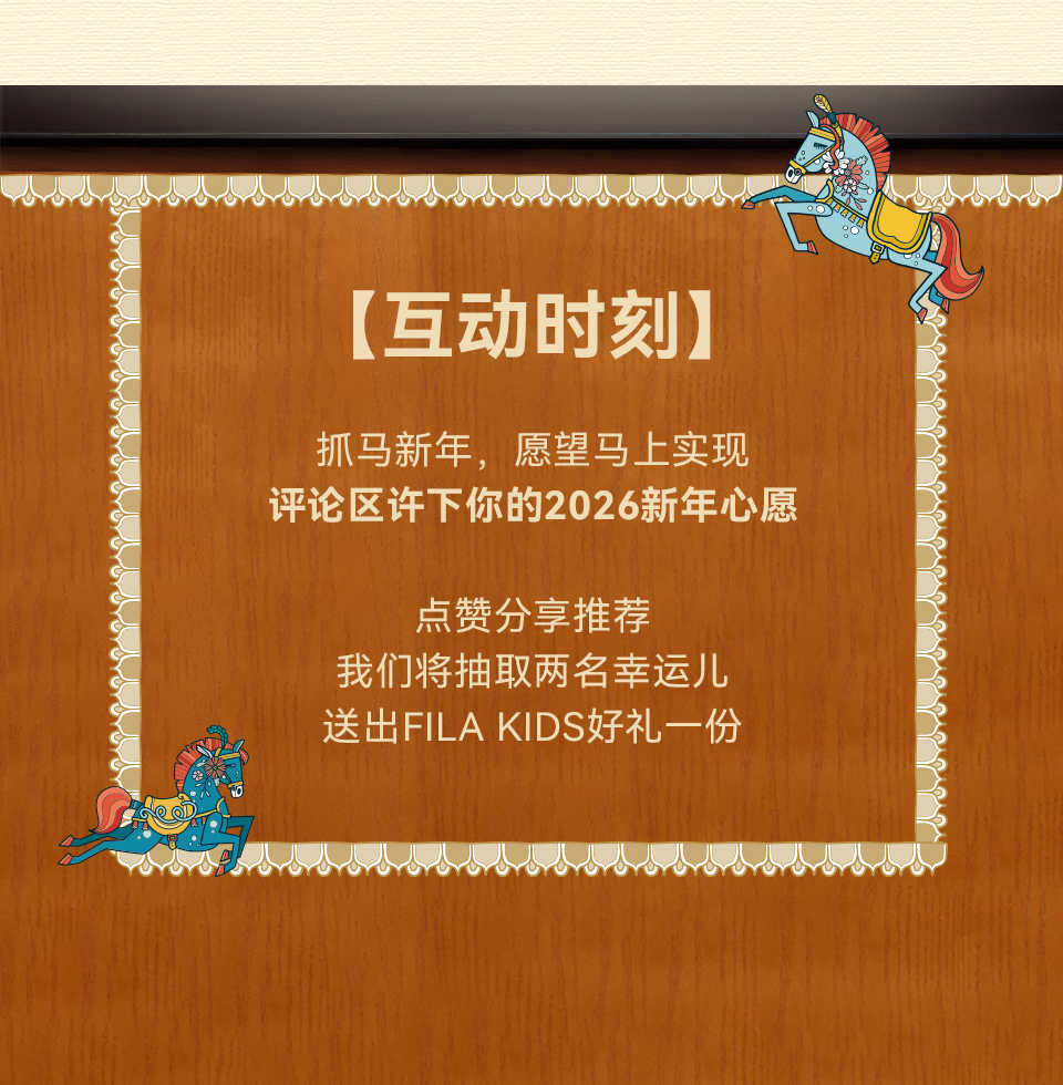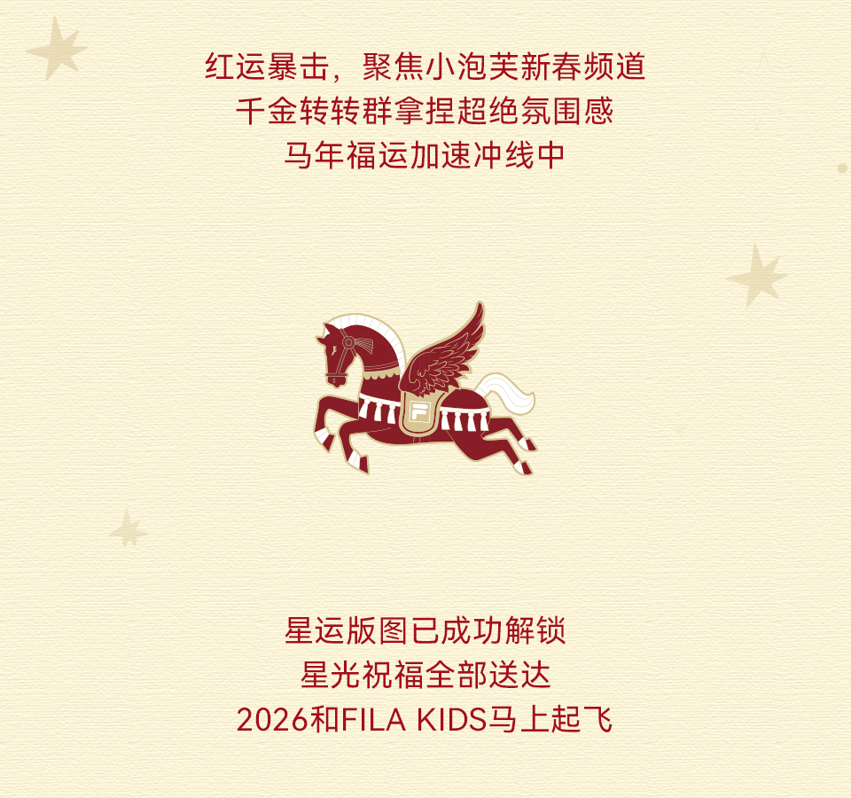 Horse Coming 新岁序幕,由星光揭开 接收「星」朋友的新春祝福 抓马新年,马上起飞 好运值UP,福气「马」上加倍 新春星动力集体送福 一键接收满格星运信号 能量条已满,好运buff加载完成 陈凯琳和小宝贝们在线营业 福运到咗,派送一波好运祝福 金马图纹喜气随身,马上顺遂 潮爸唐禹哲在线送福 新贵风亲子装,帅气齐飞 爱意同频锁定新春型格 甜蜜连击 发射福运光波 章龄之携可爱儿子隔空投送新春祝福 氛围感就位,喜气值已拉满 红运穿搭,颜值与福气同时在线 麦迪娜&姜潮携小朋友在线送福 全员笑容蓄力,萌力值已拉满 新年好运,马上兑现 萌「星」送福,自带抓马光环 杨恩又&三三力安&Julius宝贝,马年贺新春 金马跃动衣间,新年高光就位 萌「星」甜度超标,解锁新春元气局 2026抓马新年,好运马上起飞 锁定小泡芙频道,接收甜蜜暴击 千金转转群,裙摆扬起新春红弧 马年福运加速冲线中 已解锁星运版图,福运到站 所有星光祝福安全抵达 2026马力全开,「骑」开得胜 【互动时刻】 抓马新年,愿望马上实现 评论区许下你的2026新年心愿 点赞分享推荐 我们将抽取两名幸运儿 送出FILAKIDS好礼一份