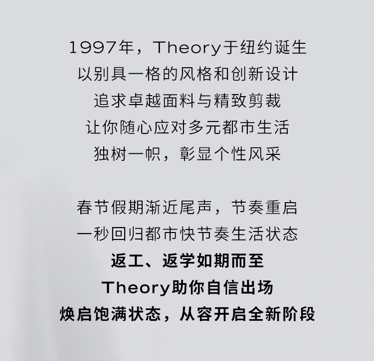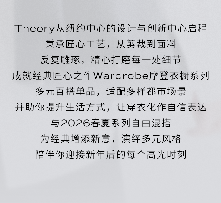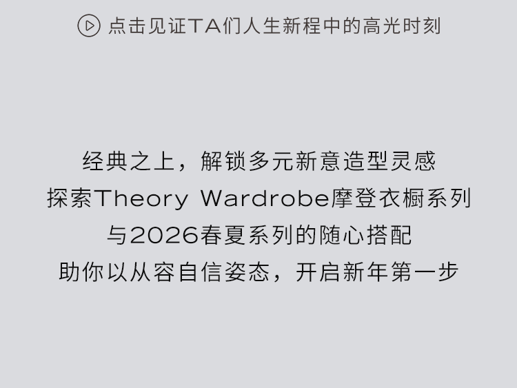 摘要:探索Theory Wardrobe摩登衣橱系列,与2026春夏系列的随心搭配,经典之上,解锁多元新意造型灵感,助你从容开启新年第一步