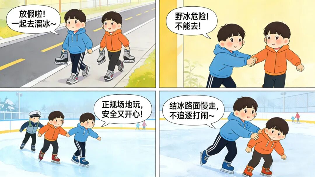 冬天最让小迪期待的,就是去户外玩雪、滑冰,这也是他假期计划里最热闹的一项,但冰雪乐趣背后,藏着容易被忽略的安全隐患。温馨提示:玩雪、滑冰要选择正规、有安全保障的场地,不擅自去结冰的湖面、河道玩耍;滑冰时要佩戴好护具,避免追逐打闹,防止摔倒受伤;遇到他人落水或意外滑倒,不要盲目施救,及时大声呼救,寻求成年人帮助,让冰雪嬉戏始终充满欢乐与安全。