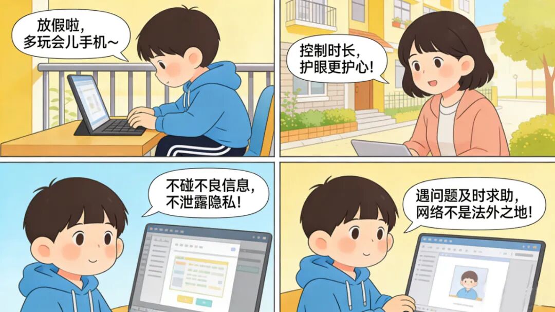 假期里,小迪会趁着空闲时间上网看动画、查资料,偶尔还会和同学在线聊天,这是他假期里放松娱乐的小计划,但网络世界纷繁复杂,安全防线不能少。温馨提示:不浏览不良网站,不点击陌生链接,不下载非官方APP;不随意添加陌生好友,不向陌生人透露个人信息,不参与网络造谣、传谣;合理控制上网时间,保护好眼睛,文明上网、健康上网,让网络成为假期里的好帮手,而非“绊脚石”。
