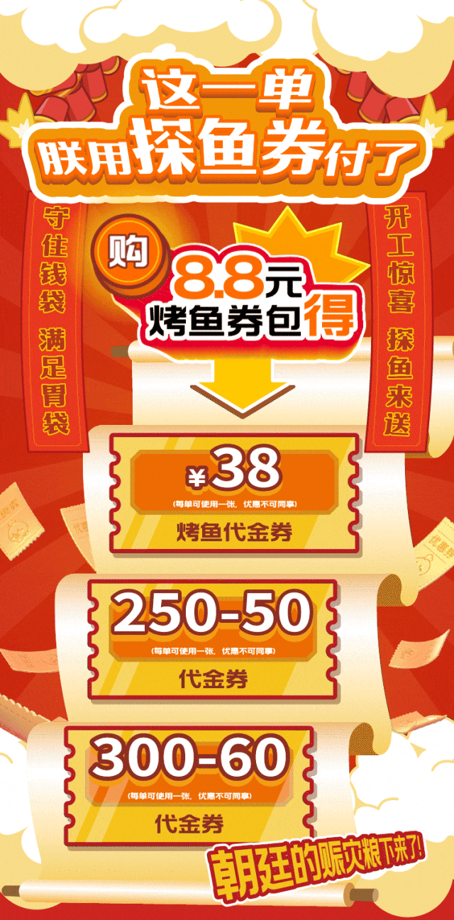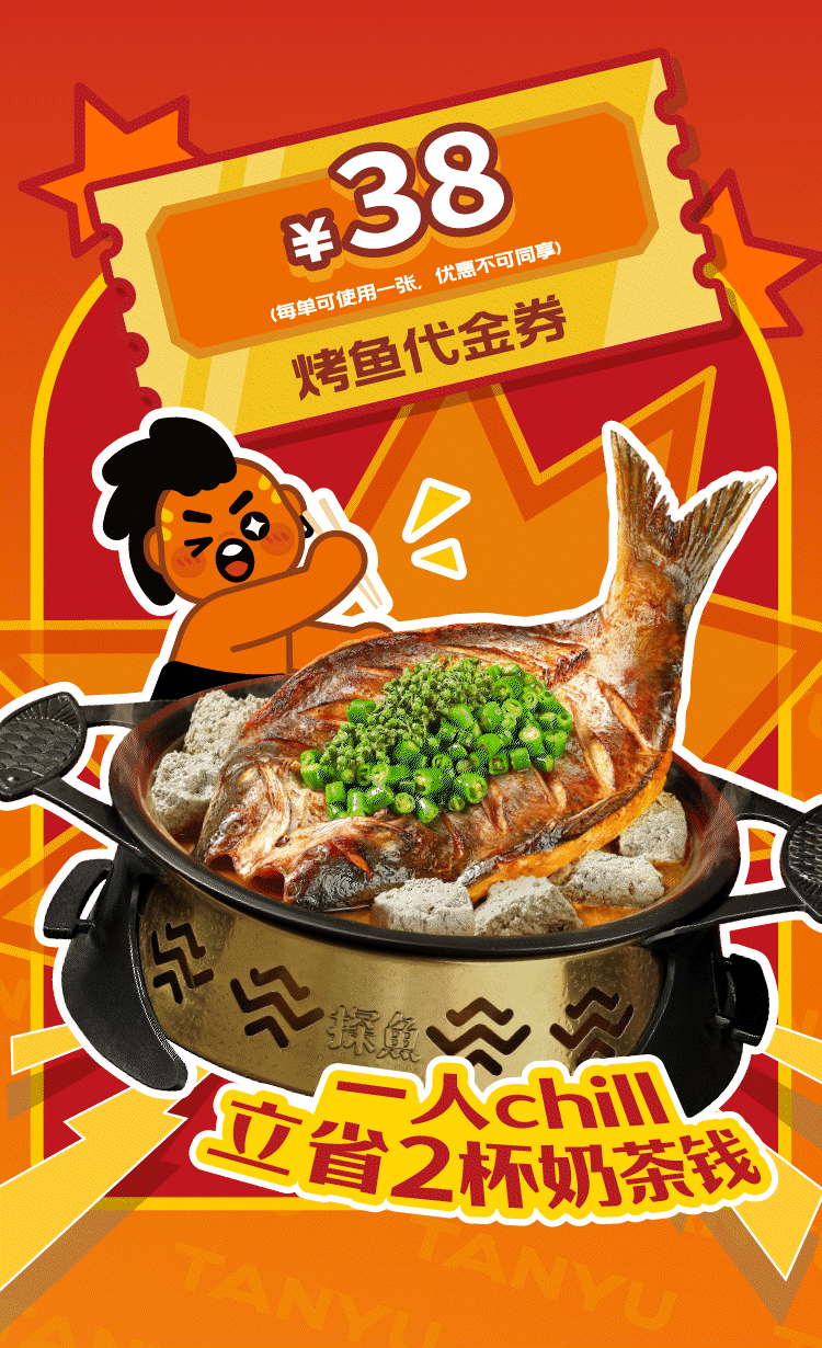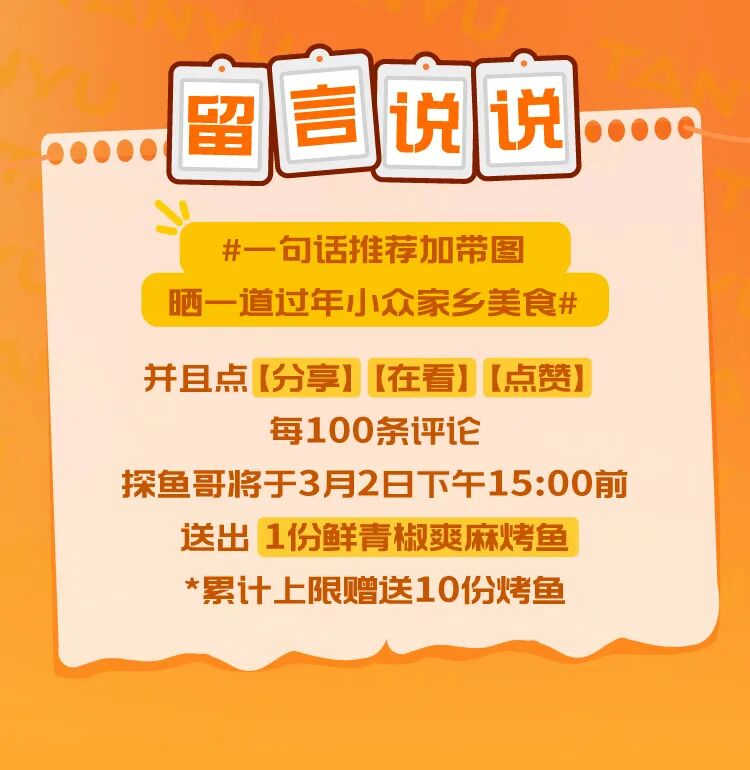 注:1.推文留言活动时间:2026年2月24日-2026年3月2日,2026年3月2日将在留言区公布留言中奖名单,奖品为鲜青椒爽麻烤鱼(凌波鱼)一份;2.奖品以卡券形式发放至会员卡包,具体卡券有效期与使用规则,可在【探鱼烤鱼】小程序 -【我的】-【优惠券】卡券详情中查看;3.仅限大陆地区探鱼餐厅堂食使用,华为店不参与活动;4.每个订单仅可使用一张卡券,不可与其他优惠同享,餐前不设外带。