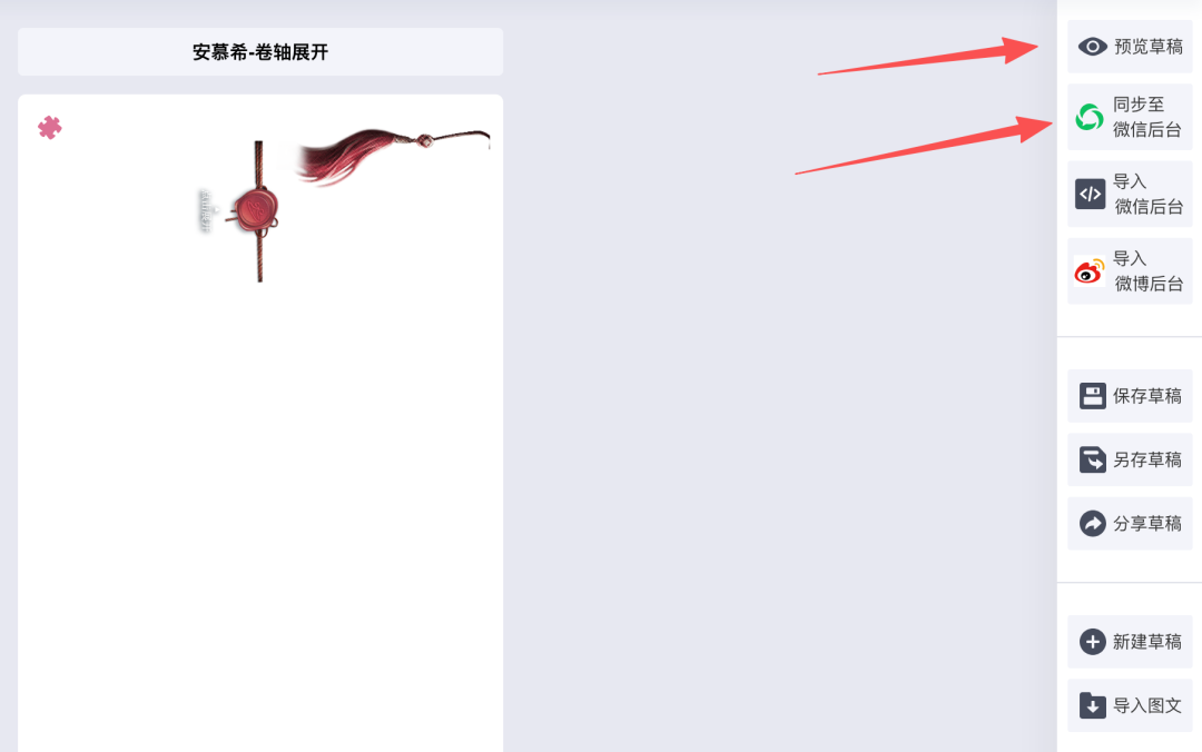 最右侧「预览草稿」可随时扫码预览效果,效果满意后点击「同步至微信后台」同步到自己的公众号就可以了。