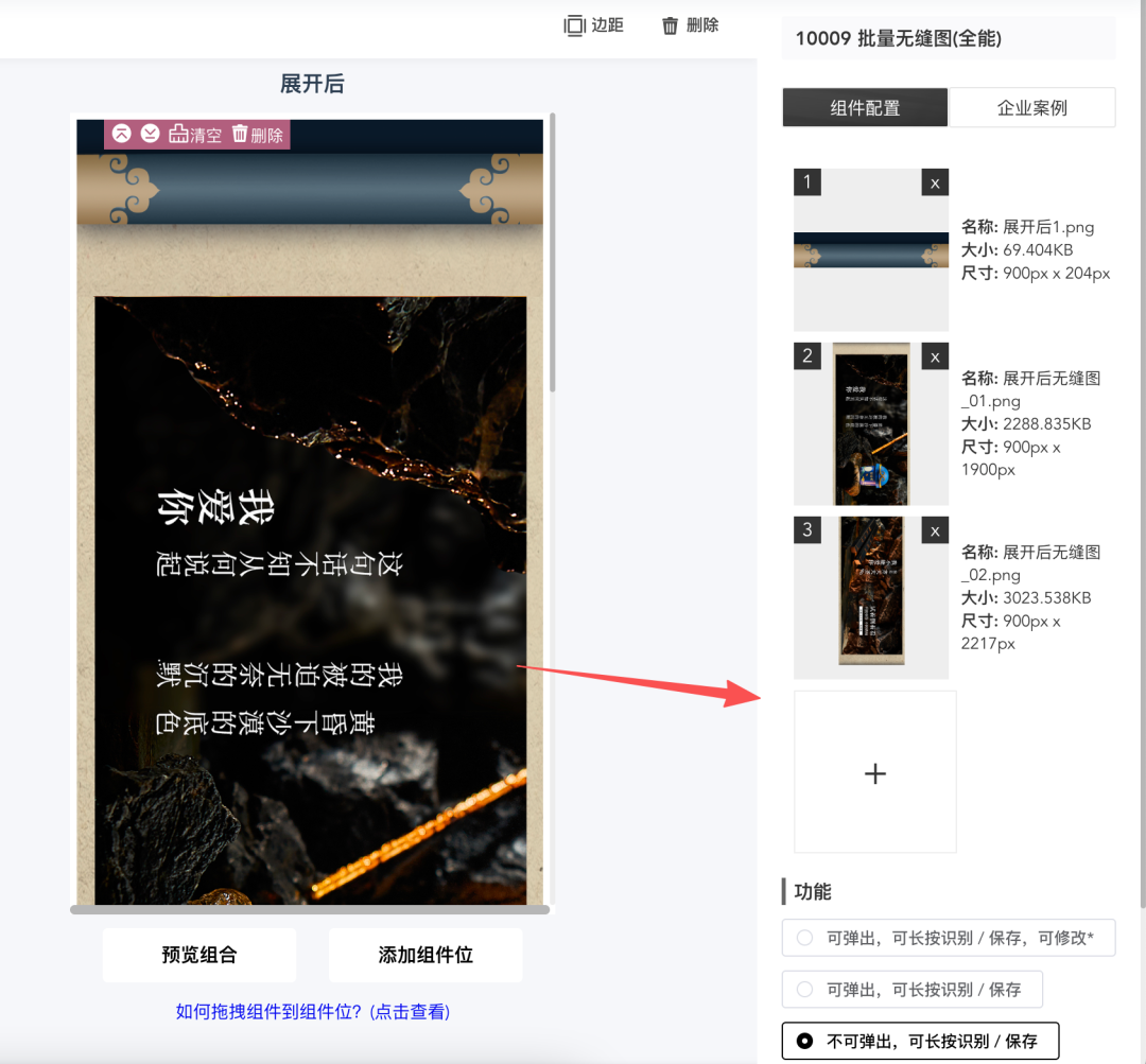 ①「展开后」的内容支持嵌套各种组件,需要什么效果就在左侧「组件」分类中找到相应的组件拖动到组件位中,然后上传需要的素材即可。