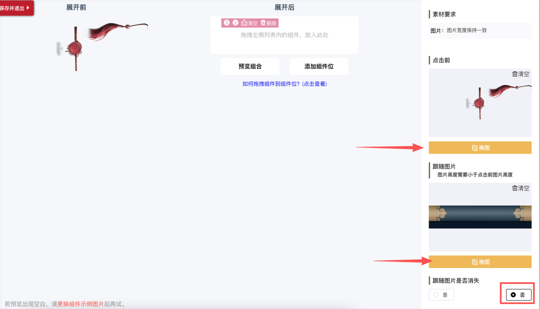 「点击前」上传引导点击展开的提示图,「跟随图片」上传卷轴的下轴部分图片。两张图片宽度需保持一致,跟随图片的图片高度需要小于点击前图片的高度。点击前图片尺寸决定了点击前整个展开的显示范围。