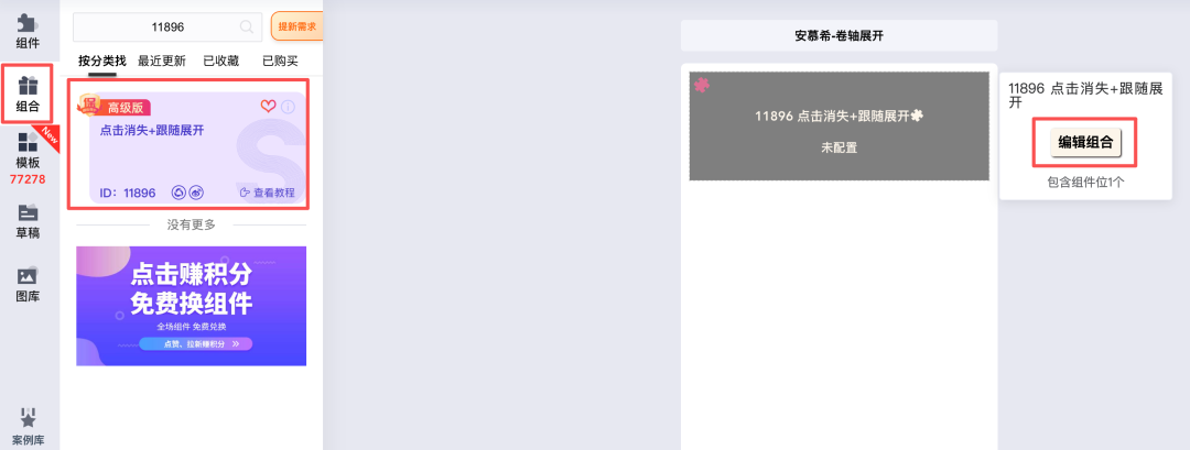 ①登录i排版SVG编辑器后,点击编辑器左侧「组合」按钮,在「花样展开」分类中找到「点击消失+跟随展开」组合,或者在组合中直接搜索编号11896,点击选择。