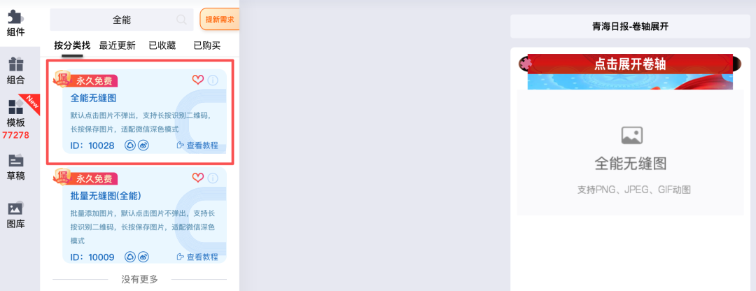 ②点击编辑器左侧「组件」按钮,在「无缝图」分类中找到「全能无缝图」组件,或者在组合中直接搜索编号10028,点击选择。